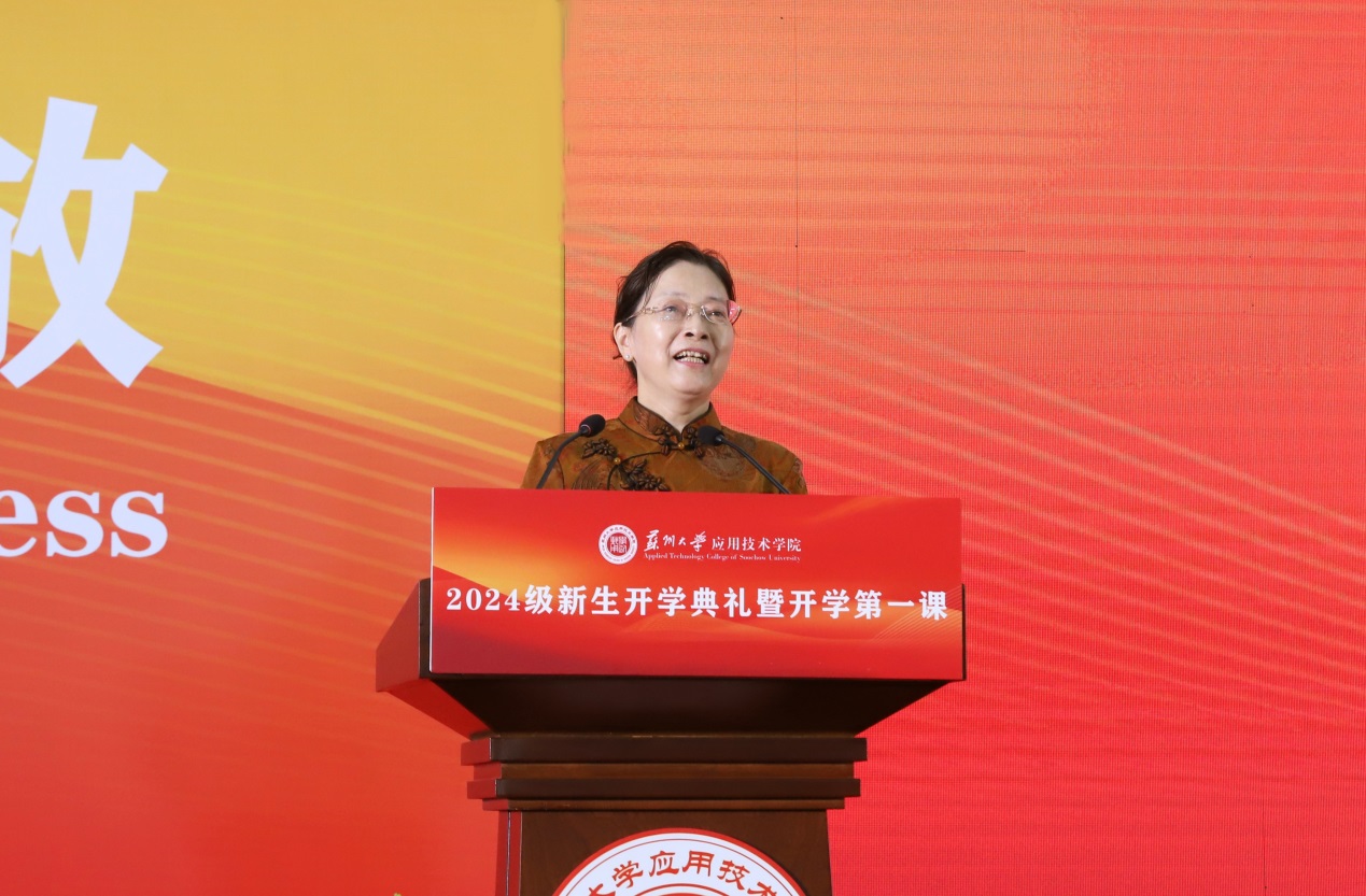 她鼓励同学们奋楫逐光启新程,品读大学的“酸甜苦辣”。希望同学们要经得住“酸”的考验,坦然面对得失;希望同学们要抵得住“甜”的诱惑,勤于探索真理;希望同学们要耐得住“苦”的寂寞,勇敢追逐梦想;希望同学们要守得住“辣”的风格,提高人生境界。在苏应传承“学以致用”的院训精神,弘扬“勤奋、开放、创新、执着”的价值理念,践行“爱国奉献、追求卓越”的优良传统,成长为具备健全人格、创新思维、实践能力、职业素养和社会责任感的苏应人!