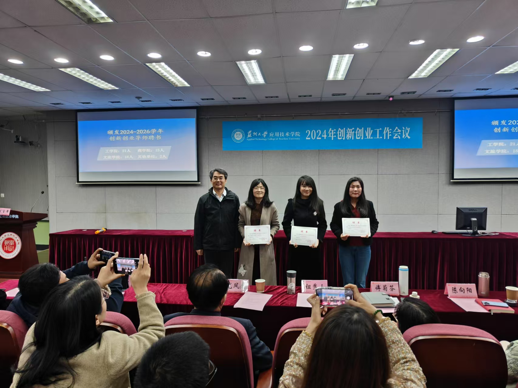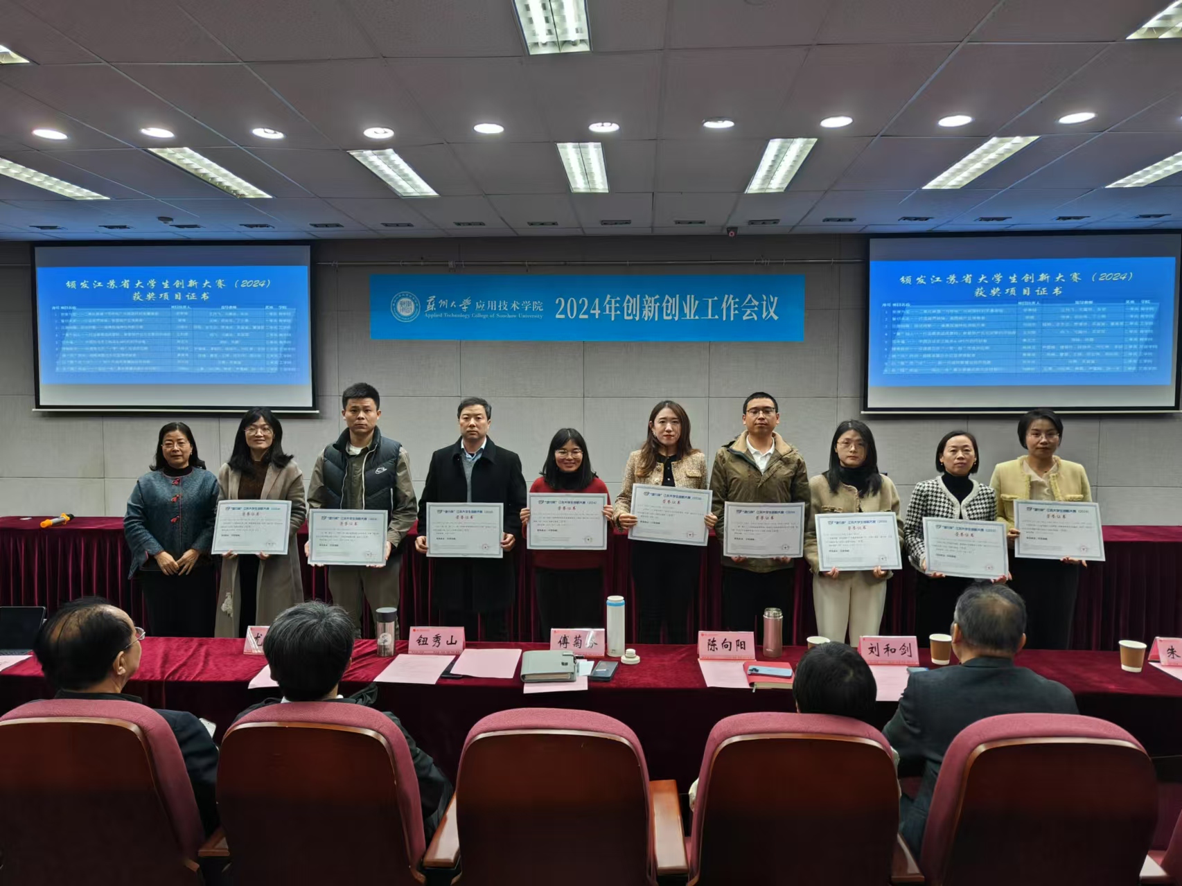 最后,颁发了江苏省大学生创新大赛(2024)获奖证书。在本次大赛中,我院学生表现出色,取得了优异的成绩。院长傅菊芬为指导老师颁发了获奖证书,并鼓励他们继续努力,为学院的创新创业工作作出更大贡献。