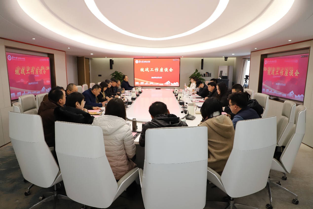 为贯彻落实习近平总书记关于做好新时代党的统一战线工作的重要思想,12月13日下午,学院党委在图书馆西512会议室组织召开了统战工作座谈会。学院院长傅菊芬,党委副书记、副院长钮秀山,副院长席拥军,纪委书记陈敏,相关职能部门负责人,各二级学院党总支书记参加了会议。会议由席拥军主持。