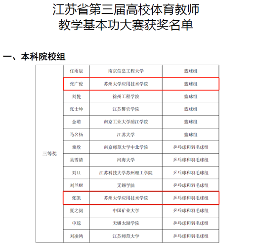 11月20日-22日,由江苏省教育厅主办的江苏省第三届高校体育教师教学基本功大赛(本科组)在南京工业大学落幕。大赛吸引了全省各本科高校的159名体育教师参加。经过激烈角逐,我院通识教育学院公共体育教学部教师张广俊和张凯脱颖而出,分获篮球组和羽毛球组三等奖。