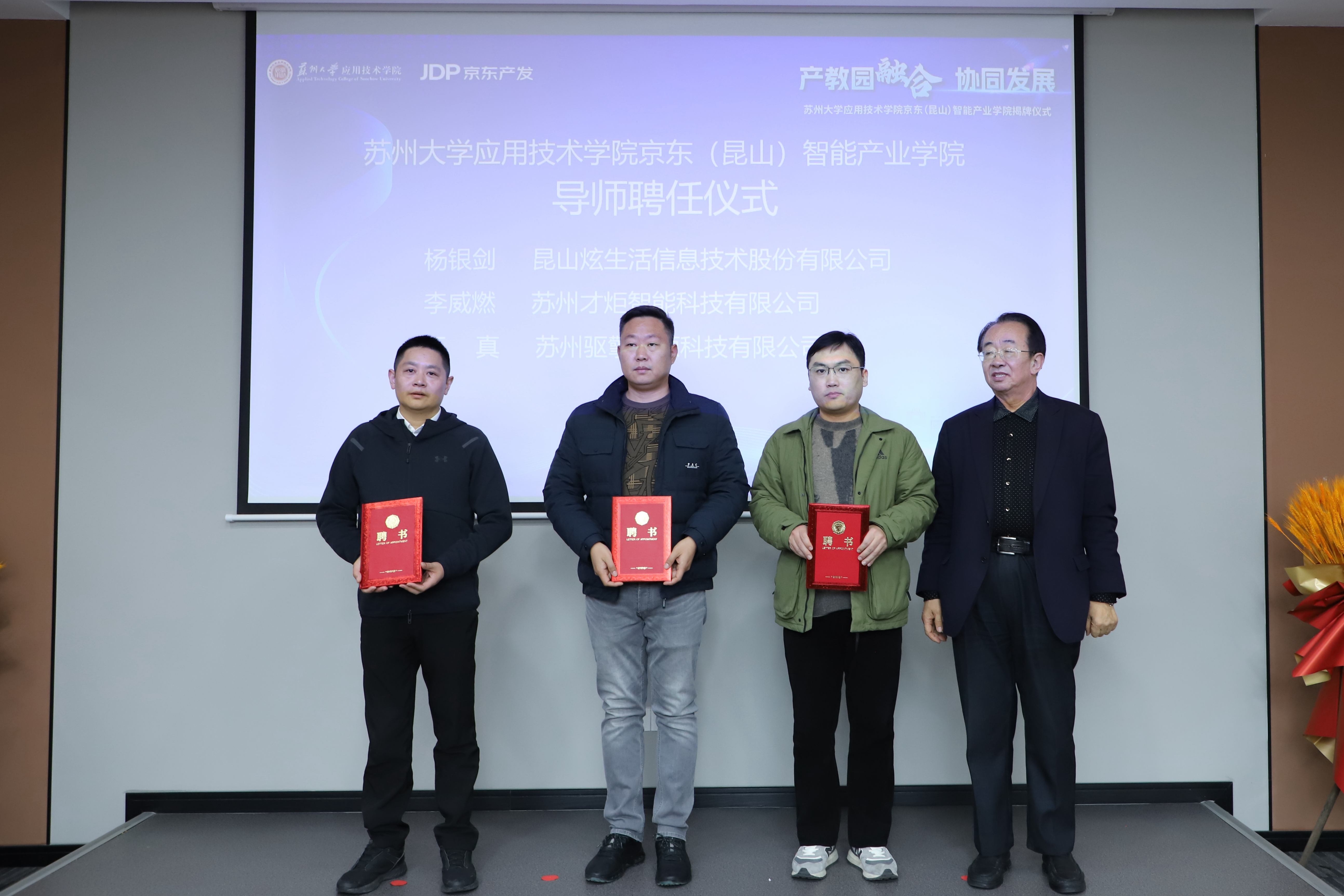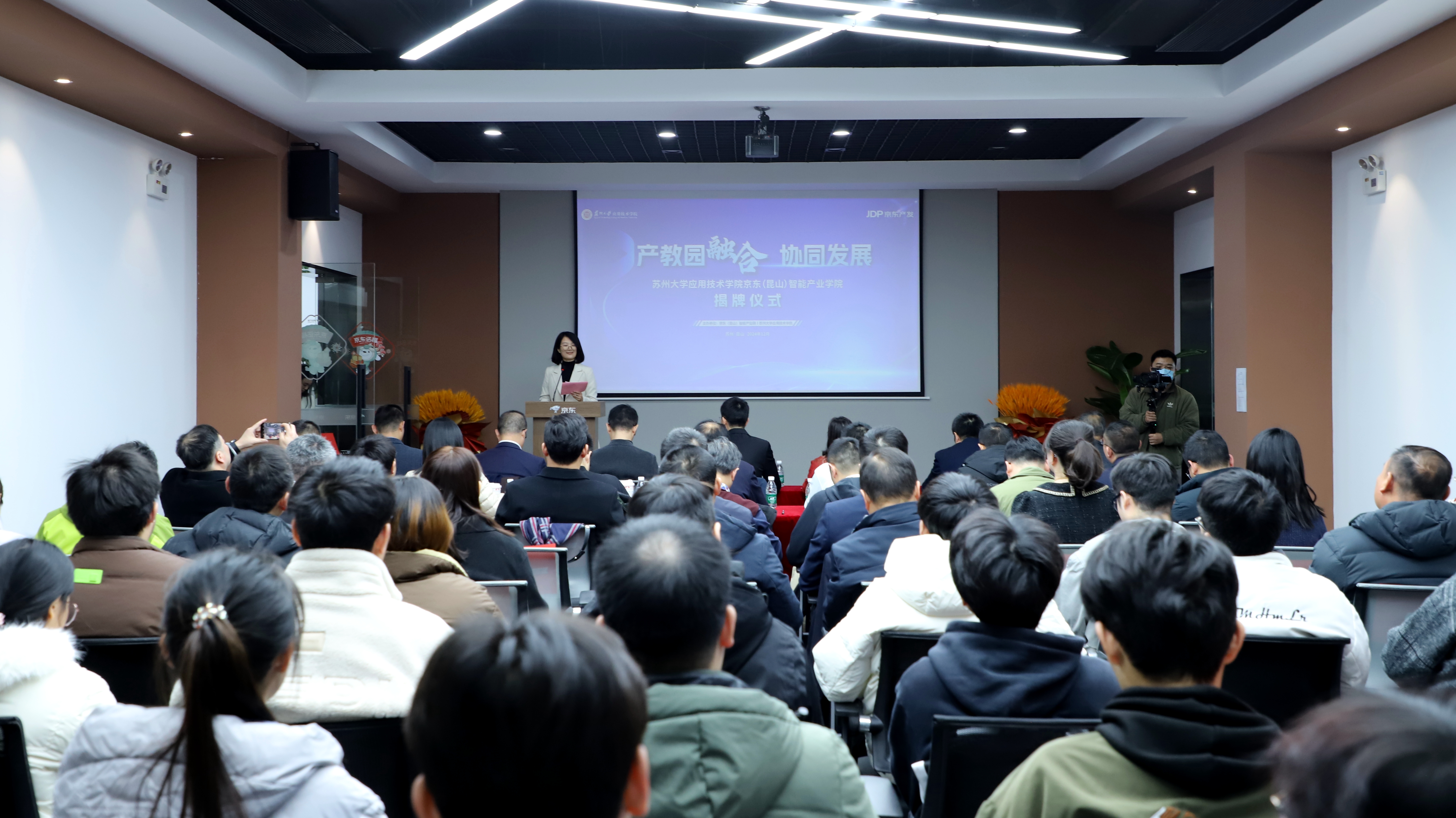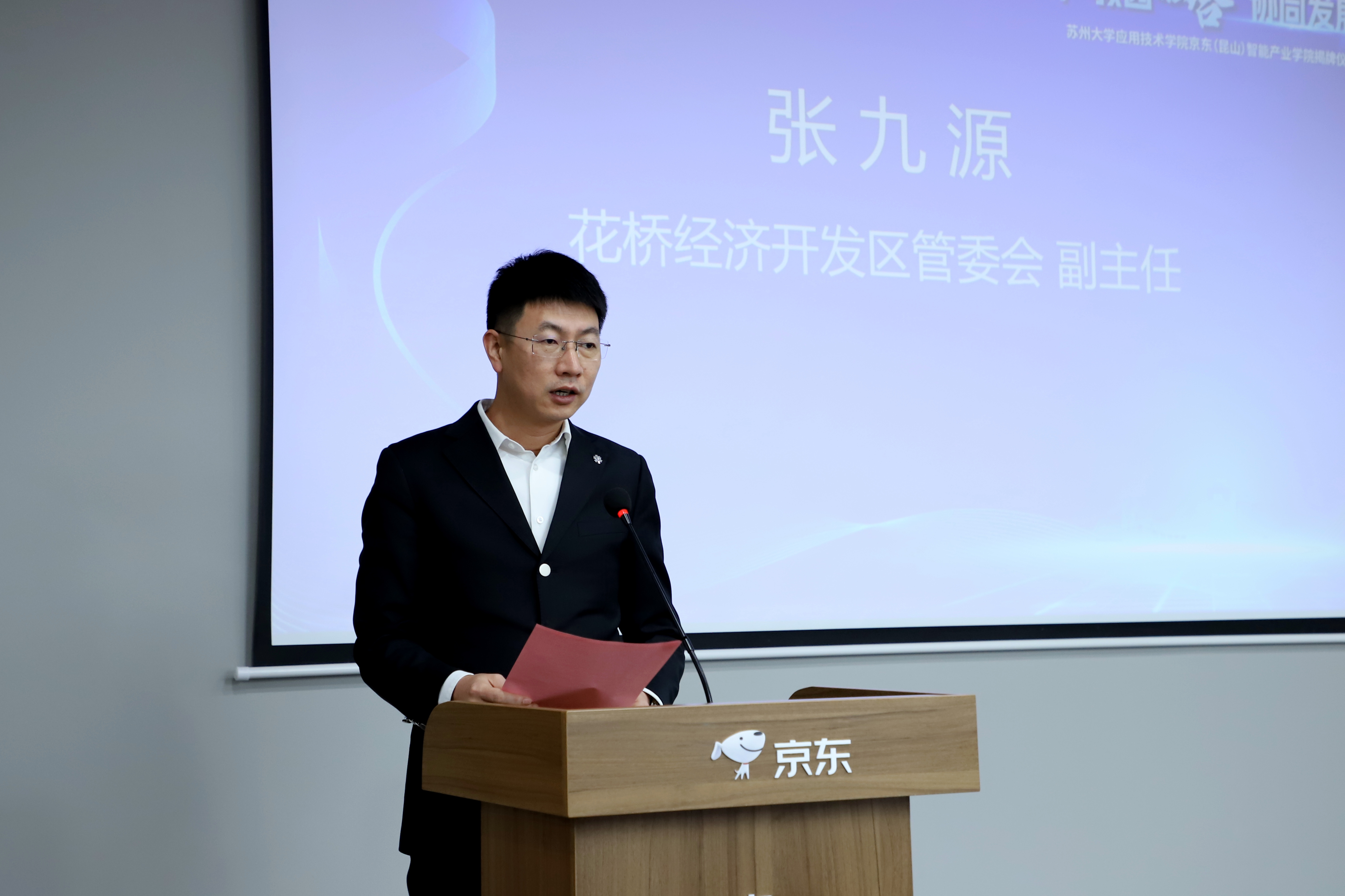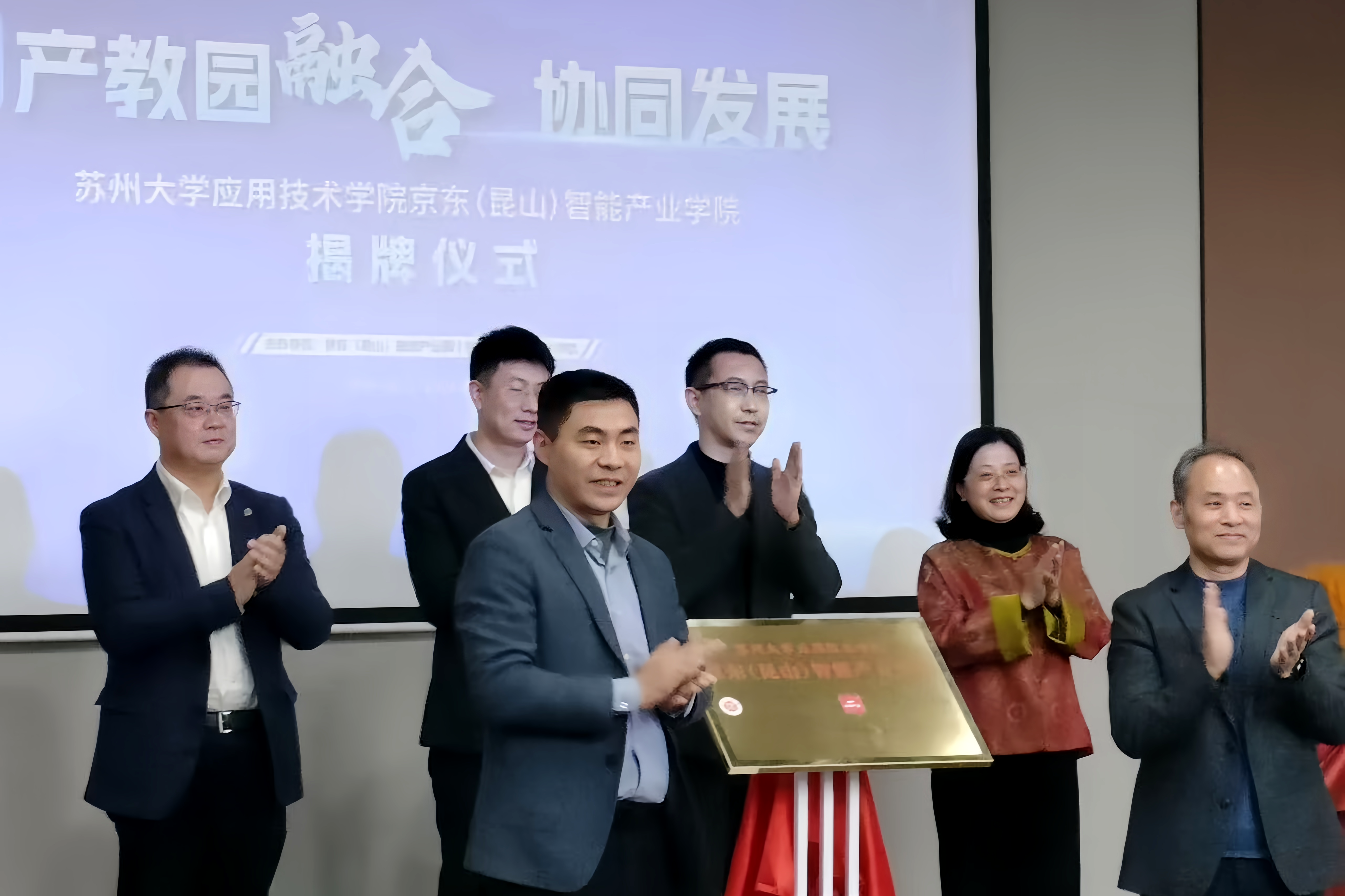 12月24日下午,苏州大学应用技术学院京东(昆山)智能产业学院揭牌仪式在昆山花桥经济开发区京东(昆山)智能产业园6号楼举行,该产业学院是由我院和京东(昆山)智能产业园共同建设成立的首个落地昆山的产教园融合产业学院。昆山花桥经济开发区管委会副主任张九源,昆山市商务局局长熊伟,昆山花桥经济开发区经济发展促进局局长王頵,京东产业发展集团副总裁高喜明,京东工业副总裁王桂喜,京东产业发展集团华东区产业总经理叶林,昆山智能感知产业技术研究院院长、苏州大学特聘教授陈立国,我院院长傅菊芬、产教融合中心主任刘和剑、国内合作办公室主任钱继兵、工学院院长尤凤翔及相关合作单位嘉宾、师生代表参加揭牌仪式。