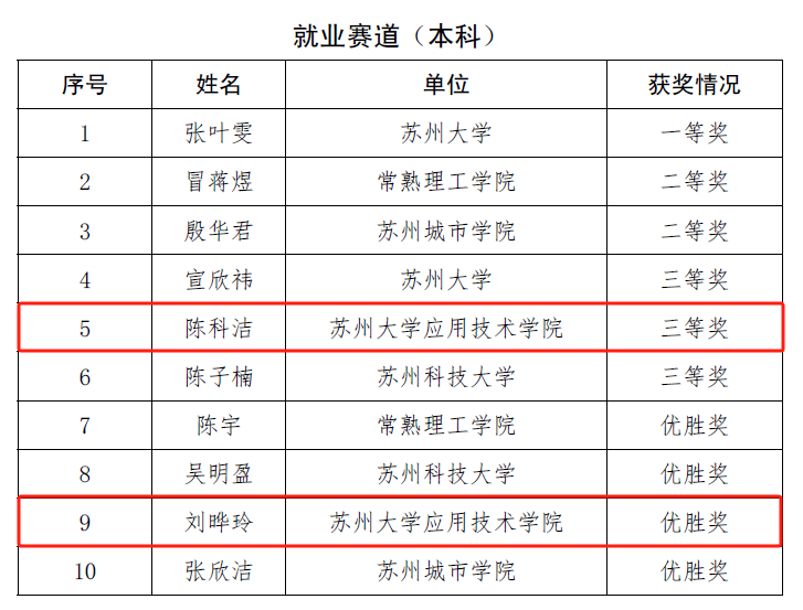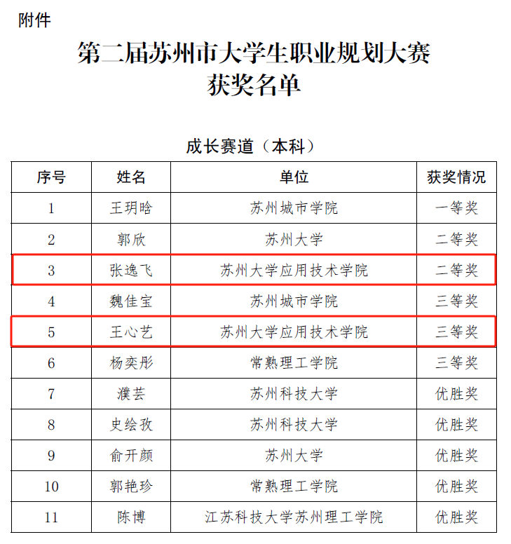 近日,第二届苏州市大学生职业规划大赛获奖名单公布,我院选送的4名学生获二等奖1项、三等奖2项、优胜奖1项。本届大赛由苏州市教育局主办,本科院校组由苏州大学承办,分为成长和就业两个赛道,经过学校初赛、苏州市复赛,来自苏州本科院校的共计21名选手晋级决赛,我院获奖数量和质量位列同类院校之首。