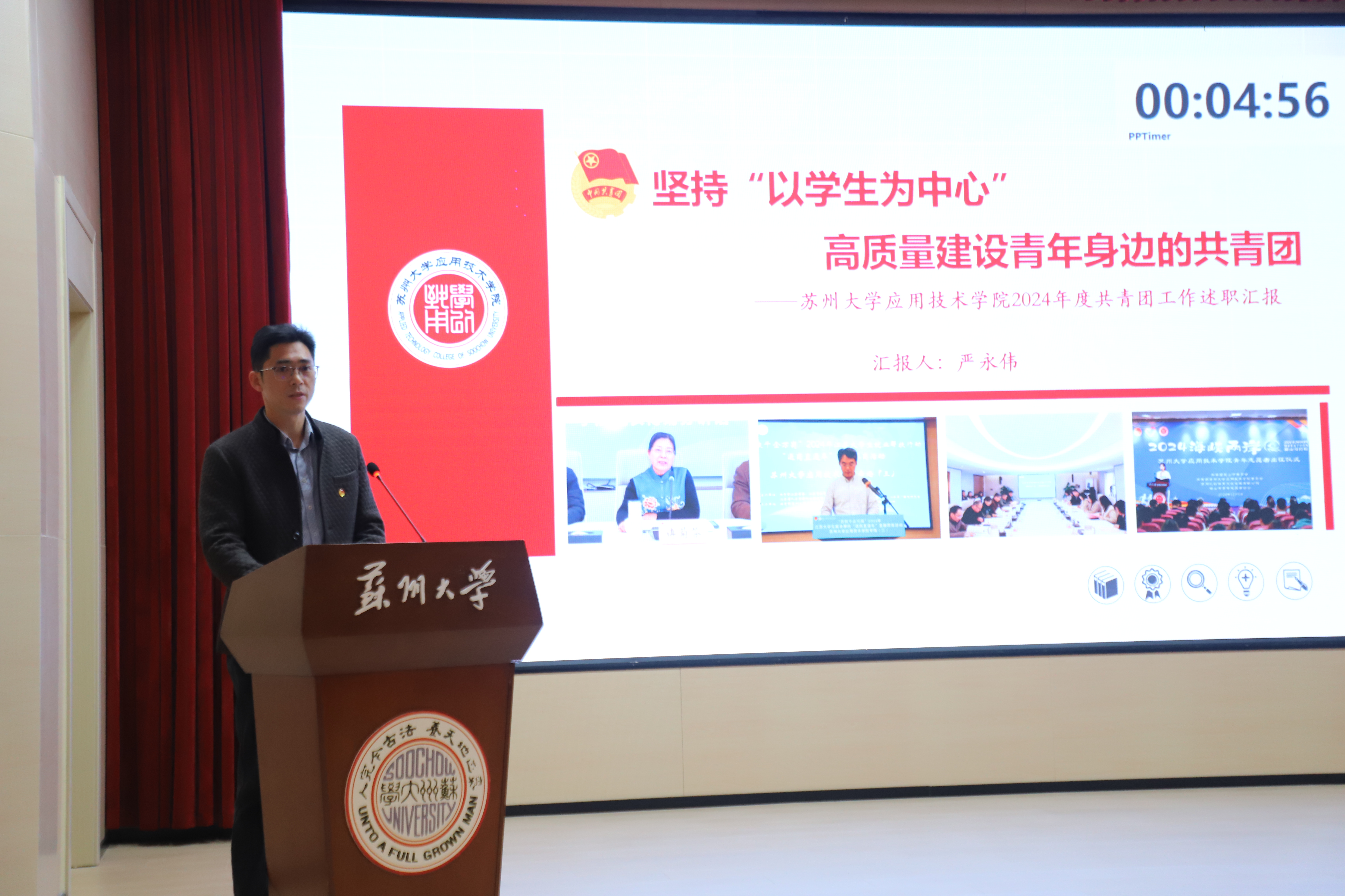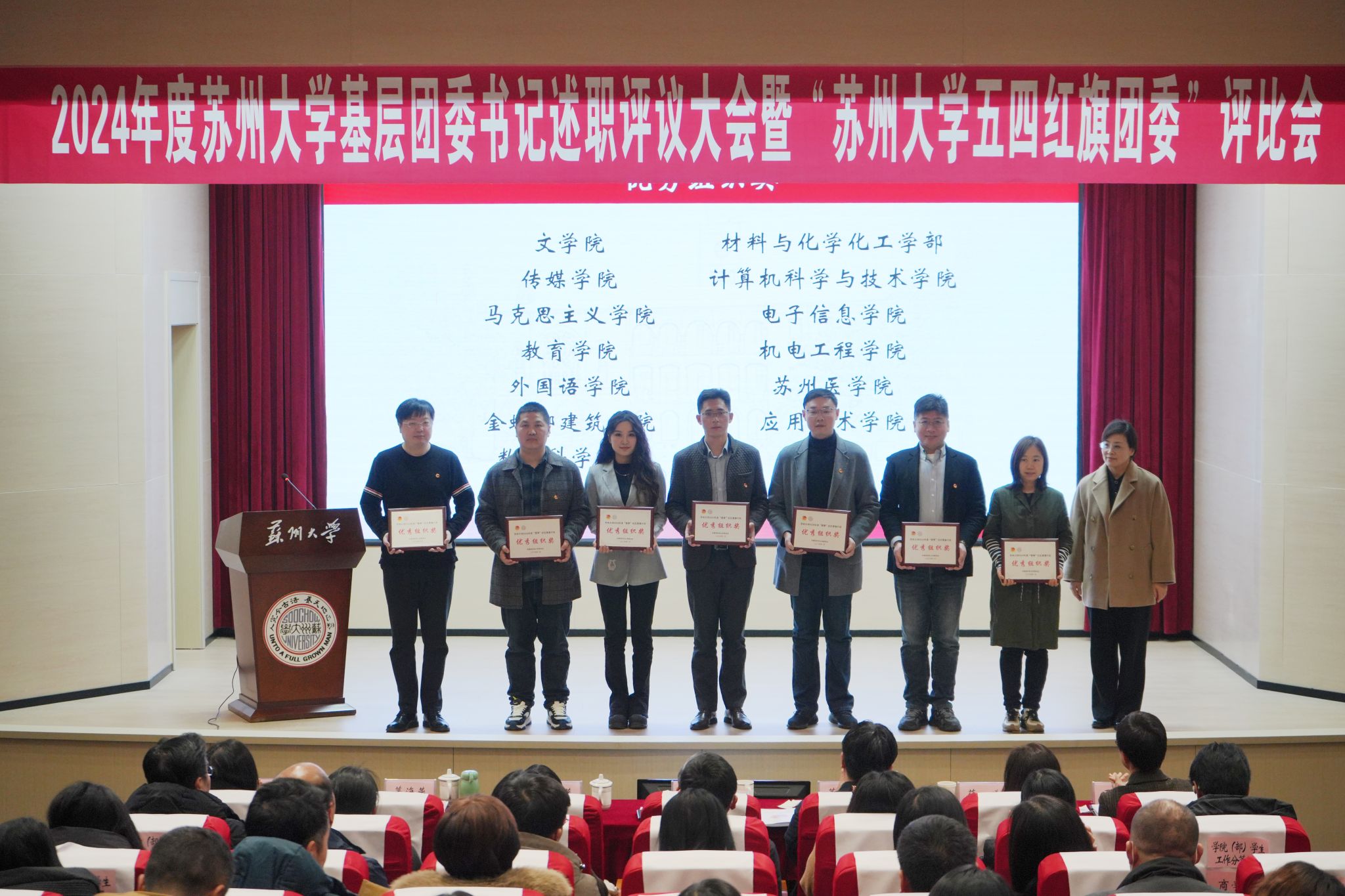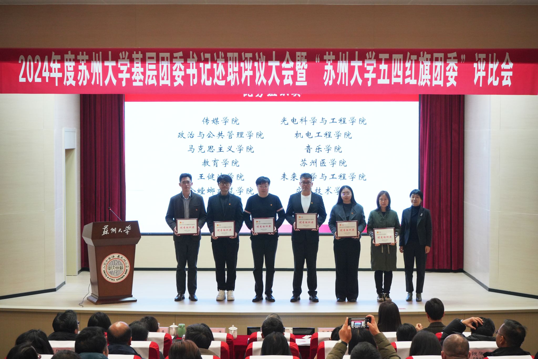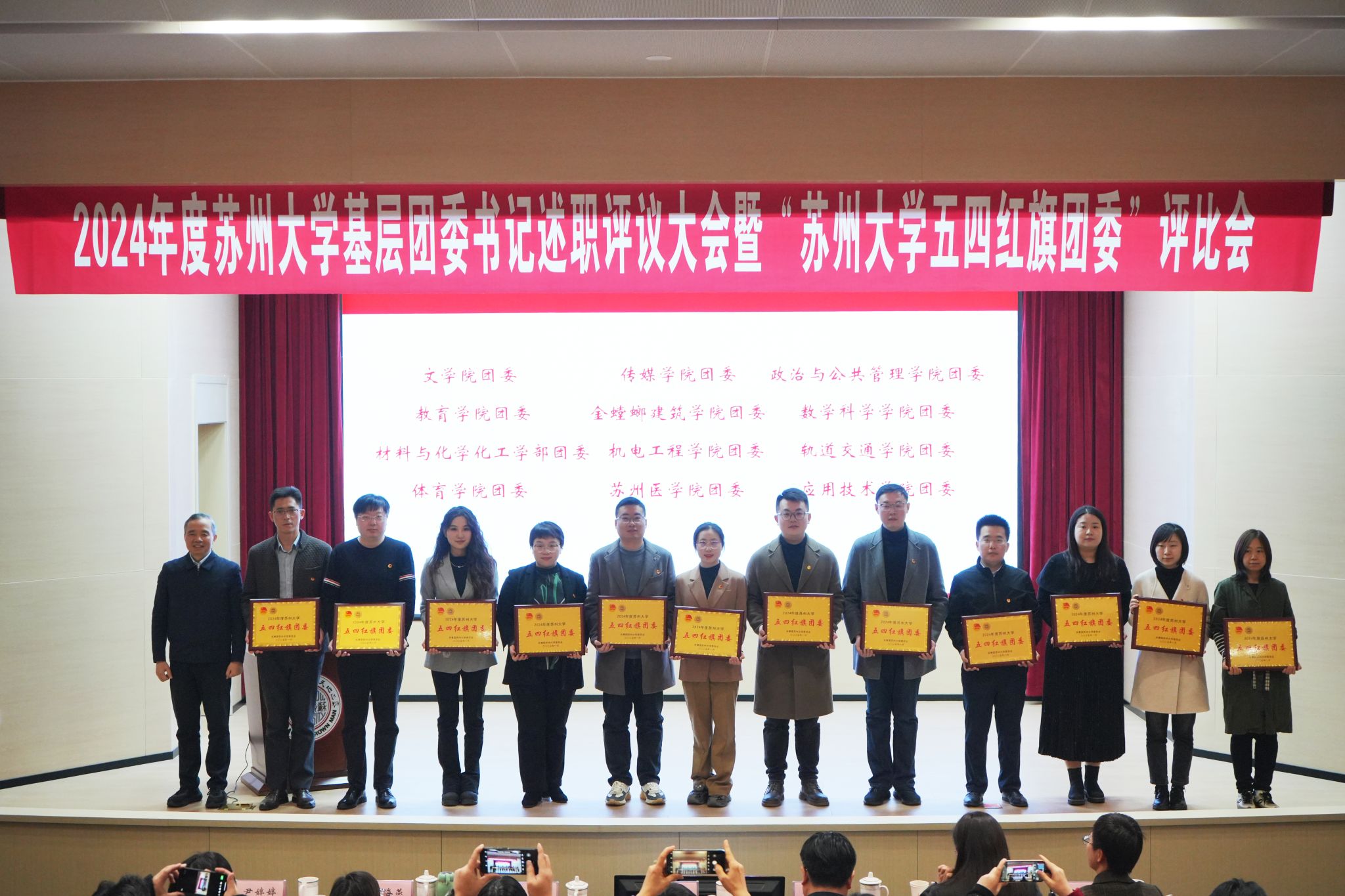 1月11日,苏州大学2024年度基层团委书记述职评议会暨“苏州大学五四红旗团委”评比会在苏州大学天赐庄校区红楼学术报告厅举行。我院团委在考核评比中以综合考核总分第二名的成绩荣获“苏州大学五四红旗团委”荣誉称号。同时,学院团委还荣获苏州大学2024年度暑期社会实践活动“优秀组织奖”,苏州大学2024年度“惠寒”社区青春行动“优秀组织奖”。