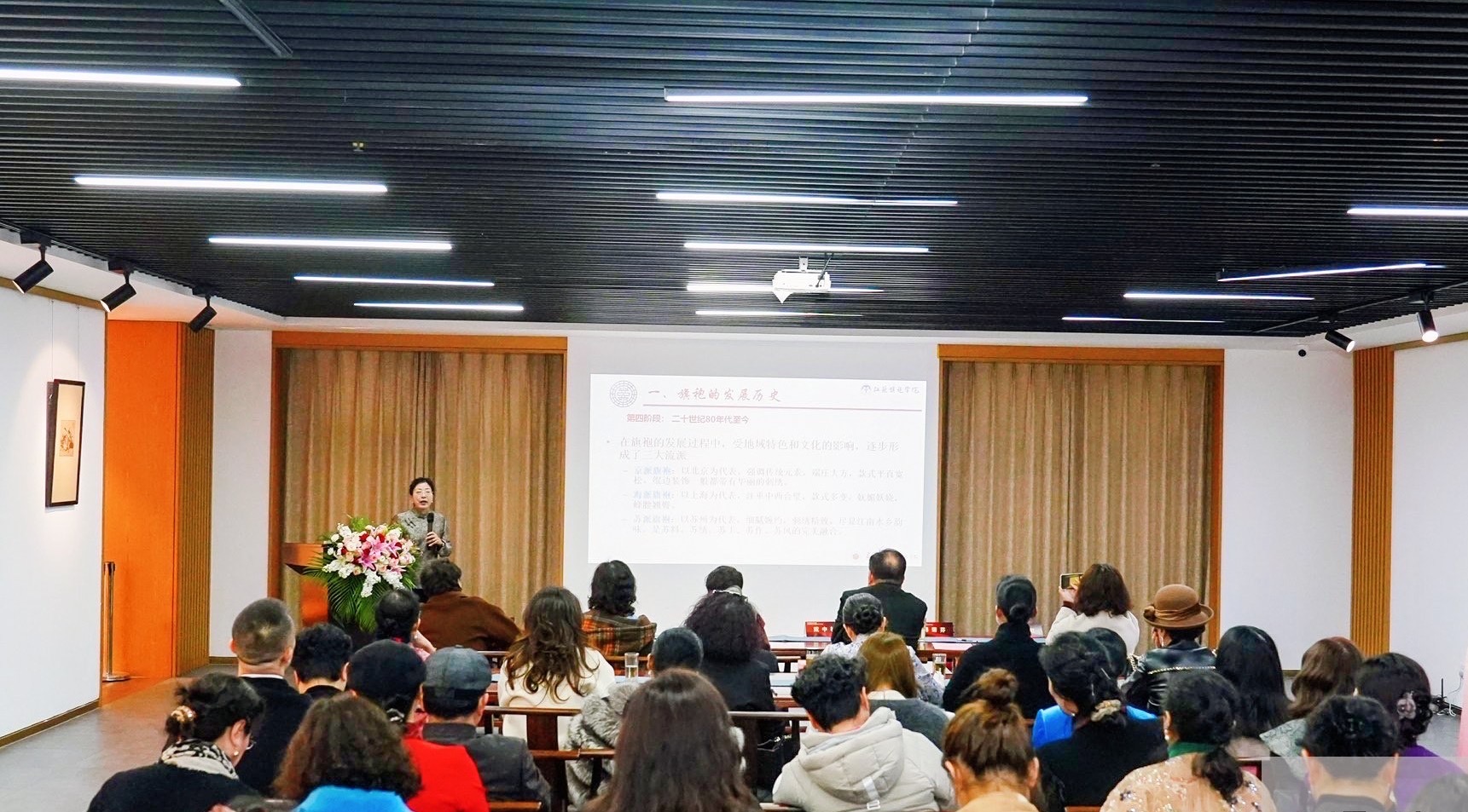 讲座伊始,傅菊芬从旗袍的发展历史入手,以时间为轴,生动讲述了旗袍从清代旗女之袍到民国时期风靡全国,再到如今成为代表中国女性优雅气质的经典服饰的演变历程。她指出,旗袍的每一发展阶段都深深烙印着时代的印记,是社会发展、文化交融的缩影。随后,她着眼于旗袍的立领、盘扣、开衩等特征元素,深入剖析旗袍所承载的东方美学理念与蕴含的精湛传统工艺。