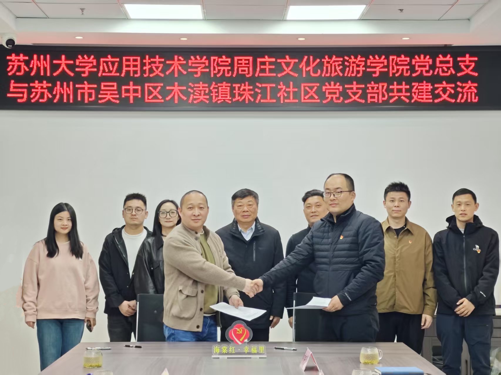 活动伊始,周庄文旅学院党总支书记燕君对学院的基本情况及未来共建合作事宜进行了详细介绍,木渎镇珠江社区党支部书记马威就社区情况、共建需求进行了具体的阐述。双方围绕“党建+高校+社区”融合共建的模式进行深入交流,就党建资源共享、实践活动、基层治理等方面达成共识。随后,双方共同签订了党建共建协议书。