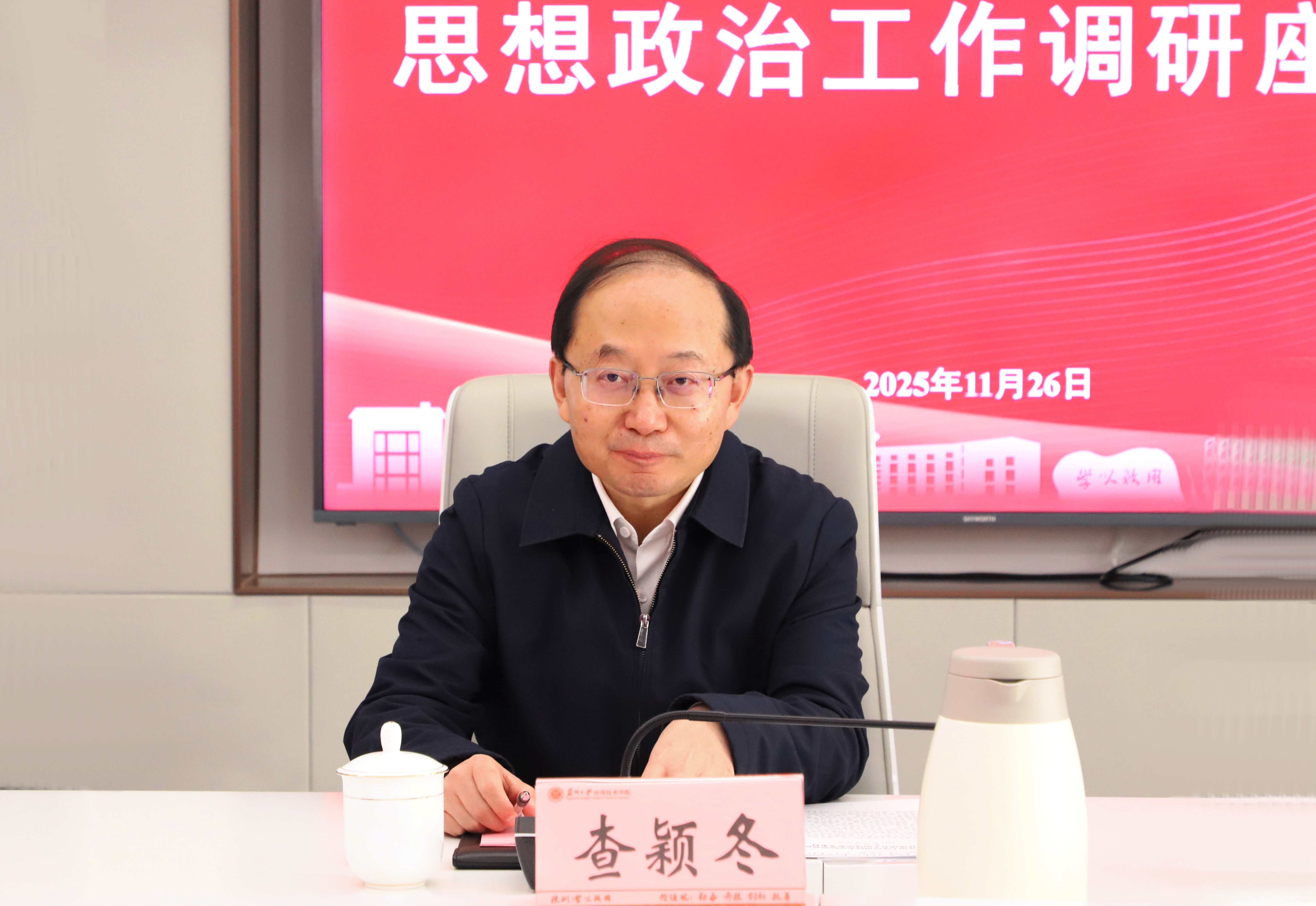 11月26日,苏州市副市长查颖冬来我院调研思想政治工作。市教育局副局长沙涛、市委宣传部理论处处长刘锟、市政府办公室综合三处副处长凌雨浩陪同调研。
