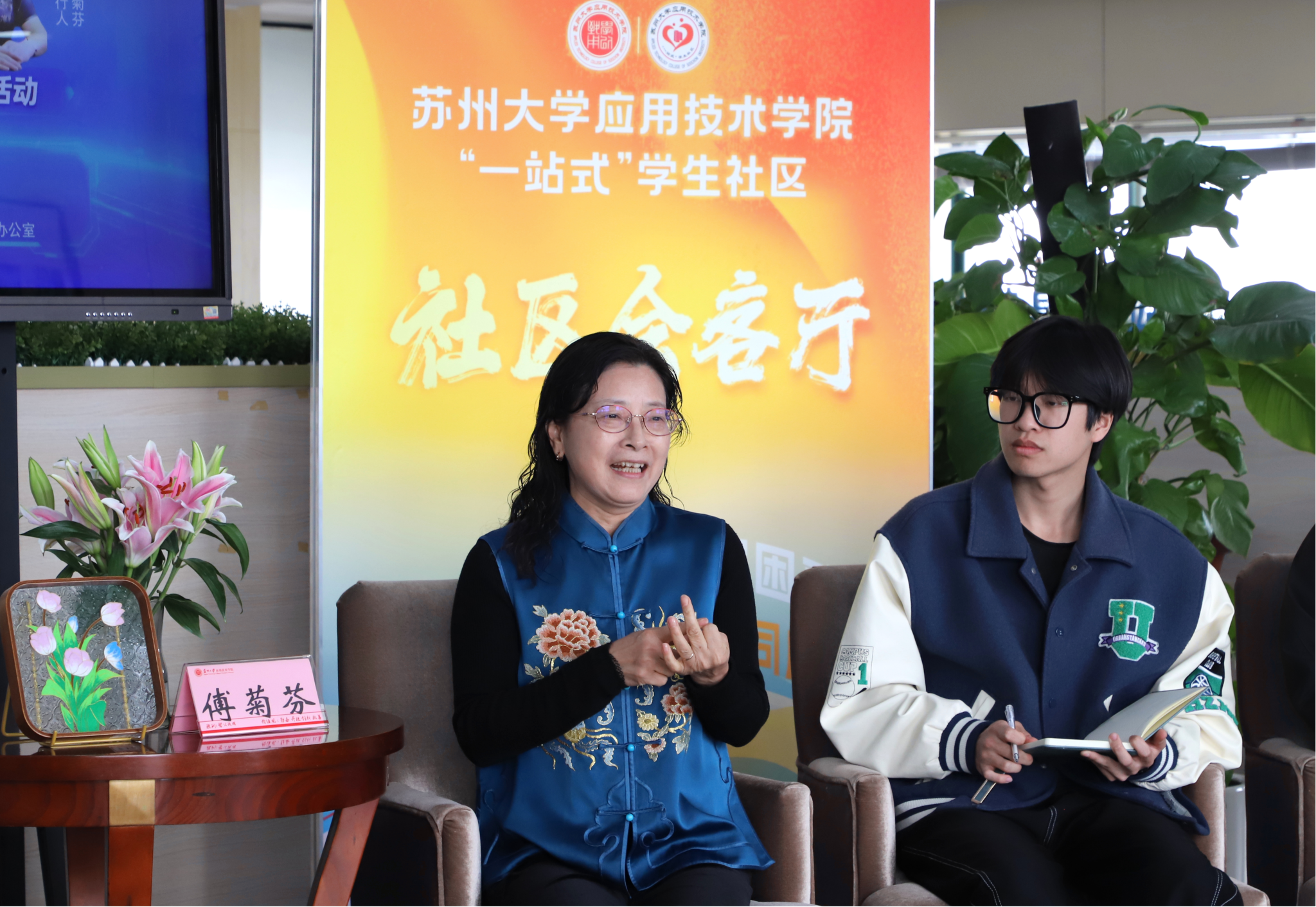 活动期间,学生代表向傅菊芬赠送他们的掐丝工艺手工作品,以匠心传递对院长的敬意与感谢,师生互动温情满满,现场氛围温馨融洽。在热烈的掌声中,本次“社区会客厅・成长同行人”主题活动圆满落幕。