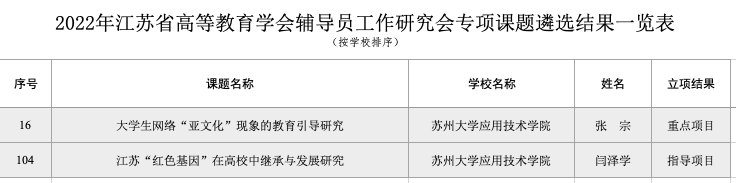 近日,江苏省高等教育学会辅导员工作研究委员会公布了2022年辅导员专项课题立项结果。本次专项课题共立项125个,其中,重点课题20个,一般课题35个,指导项目70个。我院推报的两个课题均获得了立项,其中,张宗申报的课题项目获专项课题重点项目立项,为独立学院中唯一一项重点课题,闫泽学老师获专项课题指导项目立项。这是我校坚持立德树人根本任务,重视辅导员队伍建设,促进学生工作高质量发展所取得的新成绩。