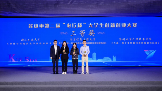 在下午举行的颁奖和授牌仪式上,市人社局局长何智勇发表了热情洋溢的致辞。他介绍了昆山高质量发展的情况,表达了对创新创业人才的渴求,热切盼望更多青年走进昆山,携手创新,共同追逐梦想,实现抱负。表彰大会上,我院再次被评为“昆山市推进大学生创新创业工作示范单位”,并获授“昆山市创业孵化基地”。另外,我院商学院推荐的项目《大禹—基于生物膜河道修复的领航者》勇夺昆山市第二届“农行杯”大学生创新创业大赛三等奖,荣获奖金1万元,并获农业银行授信100万元;项目负责人陆钰仙代表项目组上台领奖。