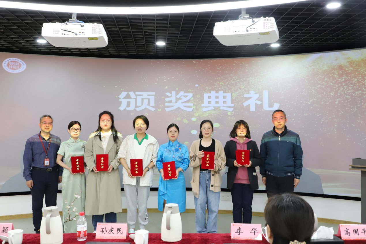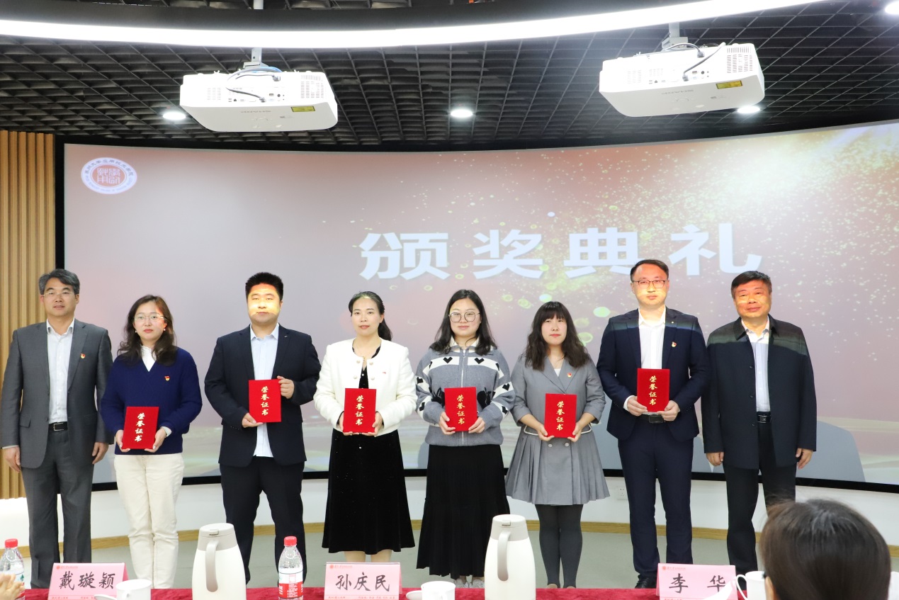 经评委现场打分,文旅学院学生第二党支部吉胜男、商学院教师党支部王天骄荣获一等奖,机关党总支严永伟、机关第二党支部吴心怡、工学院学生第三党支部李一琦、工学院学生第一党支部贾敏荣获二等奖,工学院学生第四党支部王冠、机关第四党支部刘君、文旅学院学生第三党支部杜蕊、工学院党总支张玲玲、商学院学生第三党支部刘金羚、商学院学生第二党支部周剑荣获三等奖。参会领导为获奖选手颁奖。