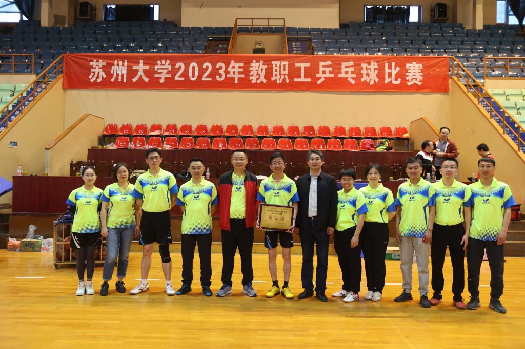 4月22日,苏州大学2023年教职工乒乓球比赛在天赐庄校区东区体育馆举行。经过全天紧张激烈的角逐,我院教职工乒乓球队凭借在比赛中的出色表现,最终获得第三名的优异成绩。