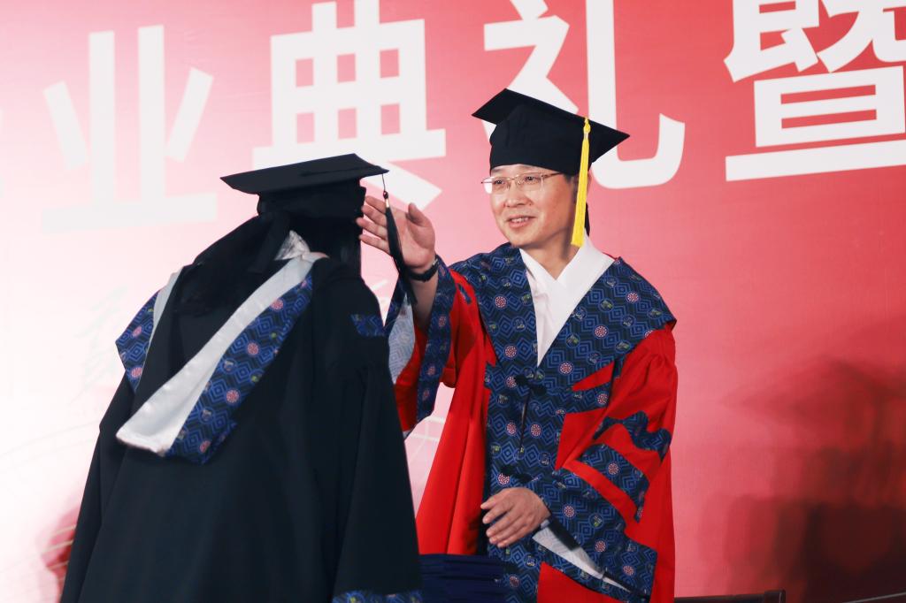 (主礼教授为学位获得者授予学位证书、扶正流苏)