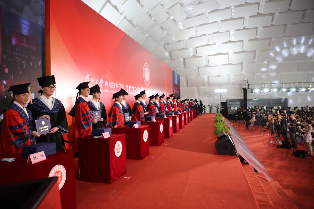 在随后举行的学士学位授予仪式上,到场的2369名2023届毕业生和454名2022届毕业生代表依次登台,由主礼教授为学位获得者授予学位证书、扶正流苏,并合影留念。