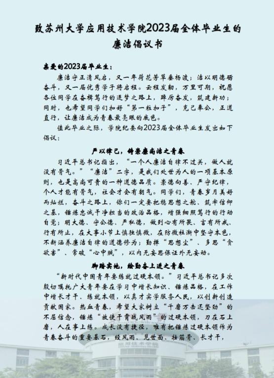 多载体传递廉洁从业意识。清正廉洁,自古以来就是中华优秀传统文化和中国特色社会主义先进文化的重要组成部分。5月下旬起,学院纪委每周推出1期廉洁教育推送,从姑苏廉吏人物、廉洁文化景点、敬业奉公楷模等主题切入点,通过新媒体平台传递崇廉尚洁的思想观念。同时,制作并发布《致苏州大学应用技术学院2023届全体毕业生的廉洁倡议书》,呼吁同学们“严以律己,铸崇廉尚洁之青春”“脚踏实地,绘勤奋上进之青春”“践廉于行,塑勤廉实干之青春”,推动“携清风出校园,做职场清白人”的思想观念入心入行。