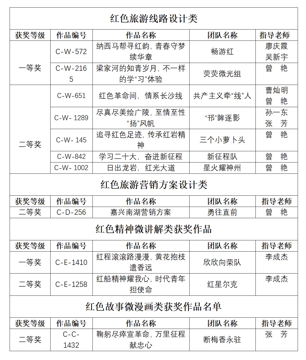 该项赛事发布以来,旅游系高度重视,在上学期选拔赛基础上,本学期链接专业课程,统筹组织,分析专项选题,规划参赛路径,历经三个月紧张准备,共申报65组,270名学生参赛,实现了指导教师类型全员化、学生参赛专业班级全覆盖、参赛类别全参与、参赛人数新高度,将专业教育、红色教育有机融合,竞赛育人效果显著。