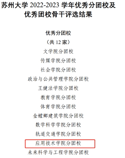 为了进一步树立典型,表彰先进,提高各级团组织的活力,激发全院团员青年立足新时代、学习新思想、砥砺新作为的热情,充分发挥团员青年的主力军作用,推动基层团组织建设进一步完善,共青团苏州大学委员会、苏州大学团校开展了2022-2023学年苏州大学优秀分团校评比表彰活动,我院团校从苏州大学众多分团校中脱颖而出,荣获苏州大学2022-2023学年“优秀分团校”荣誉称号。