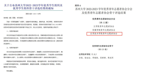 7月25日,苏州大学发布了关于公布苏州大学2022-2023学年优秀学生组织及优秀学生组织骨干评选结果的通知,我院“小青柚”青年志愿者协会获评苏州大学 2022-2023 学年优秀青年志愿者协会分会称号,陆钰仙、孙悦等5名同学获评优秀青年志愿者协会骨干称号。
