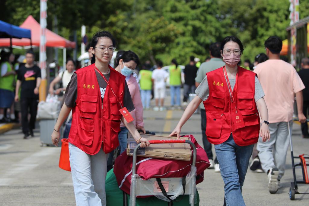 在迎新现场,学院安保队员整齐着装执行驻守、巡逻任务,引导人、车有序通行,严守校园师生安全道道防线;保洁员们化身眼观六路的“侦察兵”,不放过校园任一角落的垃圾杂物;班车司机驾驶着大巴车将新生们陆续送至“新家园”;统一着装的志愿者们,活跃在校园各个角落,步履匆匆往返各迎新工作点之间,提供咨询答疑、交通引导、秩序维护、物资分发、行李搬运等多种服务。