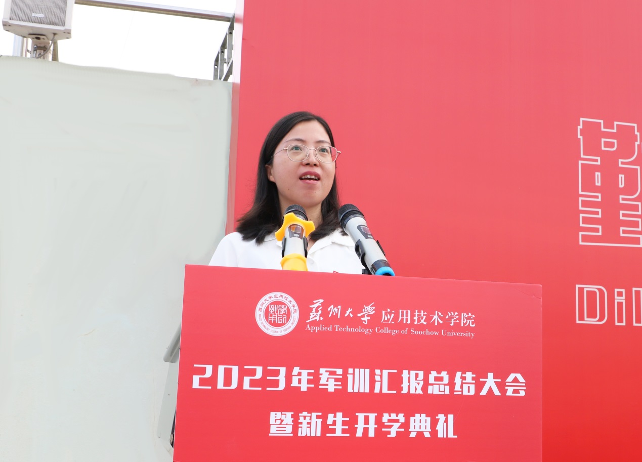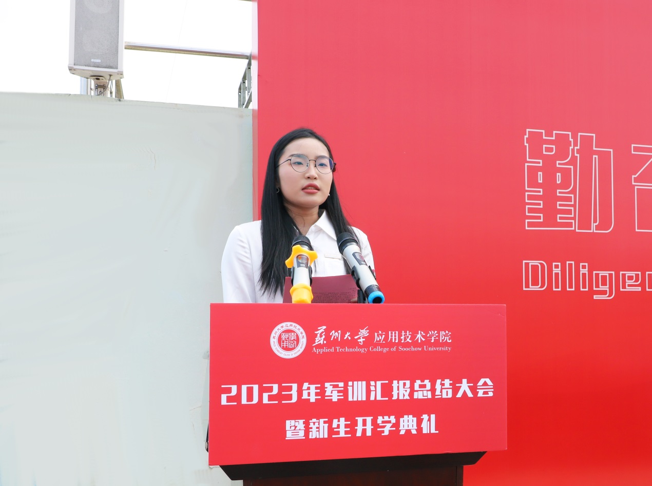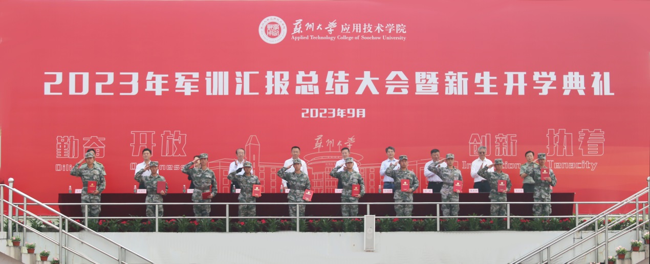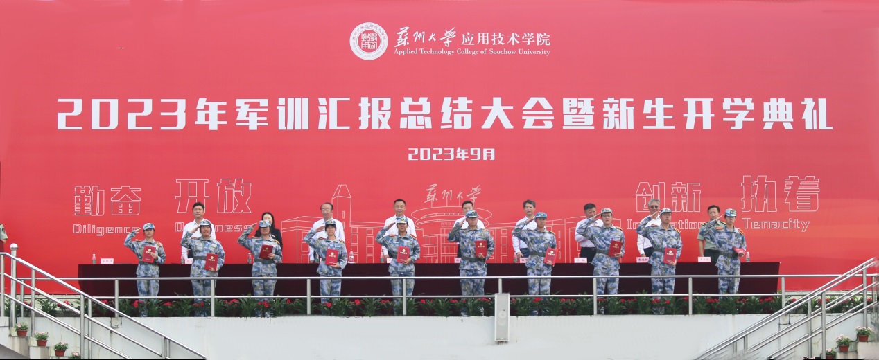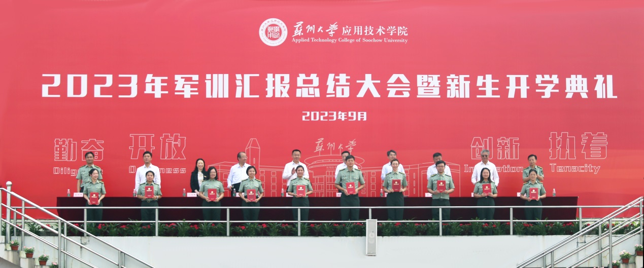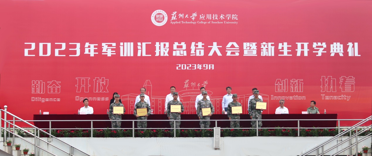 王卫东宣读了《关于表彰2023年苏州大学应用技术学院本科生军训工作先进集体、先进个人的决定》,主席台全体领导为受表彰集体及个人代表颁奖。