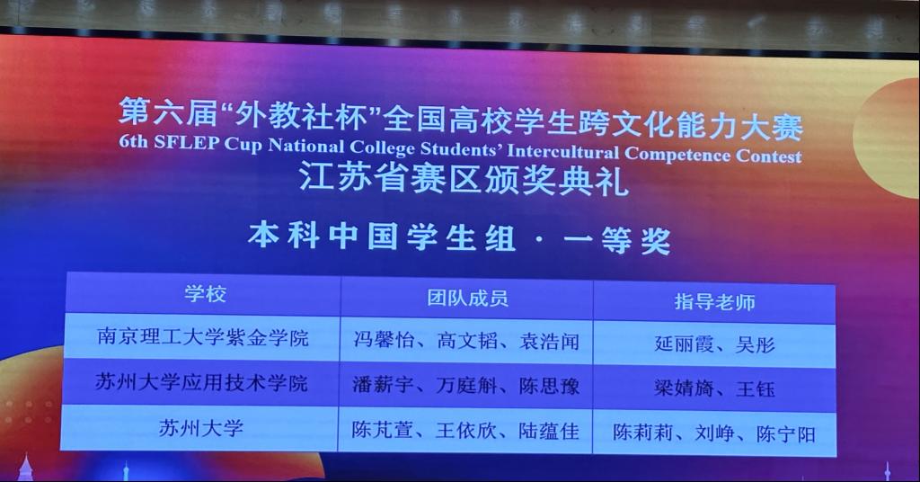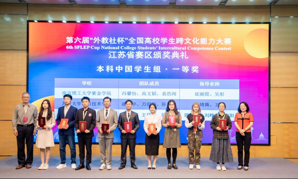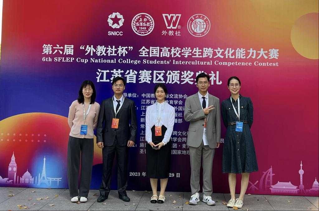 10月28日至29日,第六届“外教社杯”全国高校学生跨文化能力大赛江苏省省赛在常州大学举办。本次比赛由中国教育国际交流协会、江苏省高等教育协会指导,江苏省高等学校外国语教学研究会、上海外语教育出版社和新华日报国际传播部联合主办,常州大学承办。吸引了包括南京大学、东南大学、南京工业大学和苏州大学在内的50多所300多名师生参赛。我院学子潘薪宇、万庭斛和陈思豫在梁婧旖、王钰两位老师的精心指导下,从39支本科团队中脱颖而出,荣获江苏省赛区一等奖。