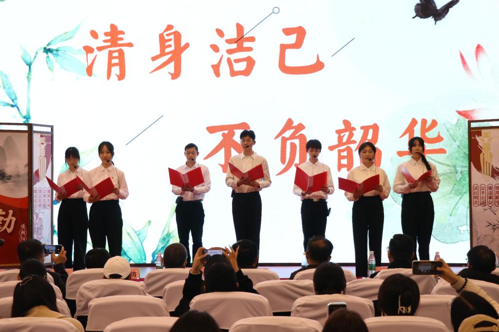 廉洁行动为。周庄文化旅游学院学生第一党支部同学表演的《不惧岁月长,一心向荣光》主题话剧,以学生考试意图作弊、学生组织招新托关系为切入点,生动形象地展现了青年学子在校期间可能涉及的不诚信行为,告诫广大学子要诚信为人,诚实做事。