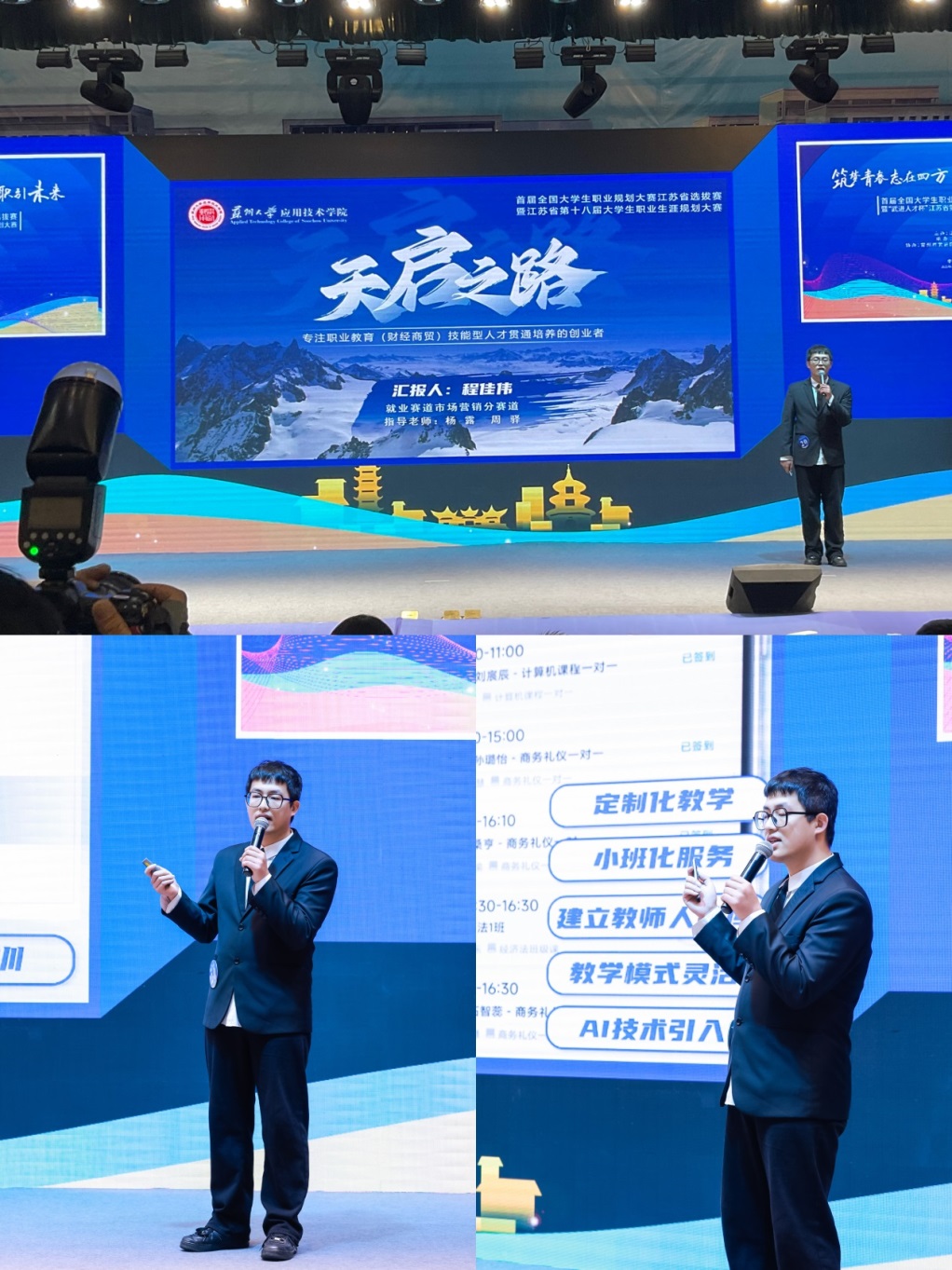 我院于今年9月启动赛事相关工作,精心组织了校内选拔赛。11月下旬,推荐4名成长赛道选手和5名就业赛道选手参加全省复赛。经过复赛网评,以“专注职业教育技能型人才贯通培养的创业者”为职业愿景的商学院市场营销专业程佳伟同学获得现场决赛资格,经过现场主题陈述、综合面试、天降实习offer三个环节的评审,最终获现场表现铜奖。