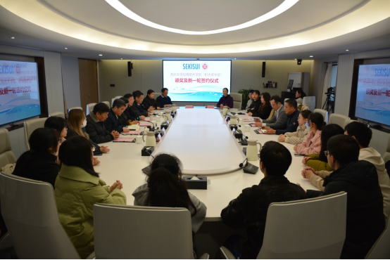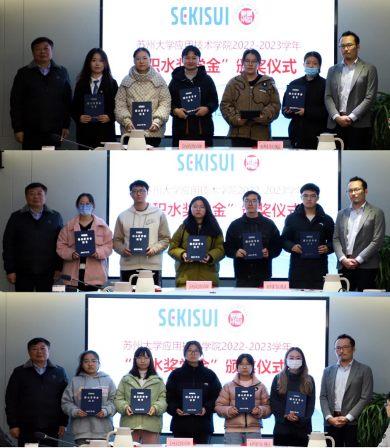 12月11日,我院2022-2023学年积水奖学金颁奖及新一轮签约仪式在图书馆西512会议室举行。积水中间膜(苏州)有限公司总经理松本学、管理部部长周贤军、总经理秘书杨馨,我院院长傅菊芬,党委书记孙庆民,党委副书记、副院长钮秀山,副院长席拥军,纪委书记陈敏,以及学生管理部门负责人、辅导员代表和15位积水奖学金获奖者参加仪式。仪式由钮秀山主持。