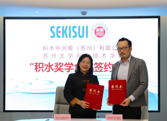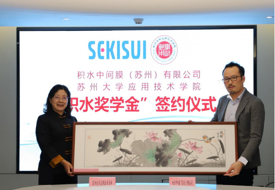 松本学和傅菊芬签署了新一轮十年的积水奖学金捐赠协议。傅菊芬代表学院向积水中间膜(苏州)有限公司颁发捐赠证书和赠送纪念品。