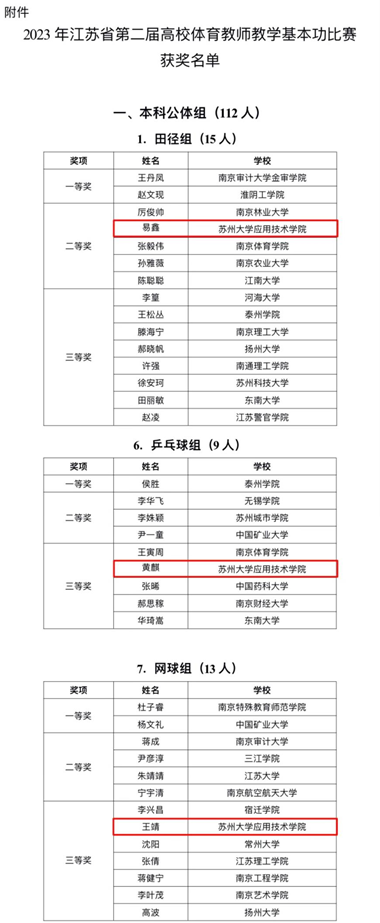 近日,江苏省教育厅公布了2023年江苏省第二届高校体育教师教学基本功比赛获奖名单。我院教师易鑫获得田径组二等奖,黄麒、王靖分获乒乓球组、网球组三等奖。