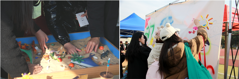 秋日“漫游”记——线下疗愈与展览活动现场设置了信任陪同、说出心中的颜色、一心二用、数字食物链、你画我猜、情绪气象站、沙盘心世界、心愿便利贴、涂形之行、“签姿百态”10个游戏摊位,参与人数达近800人。