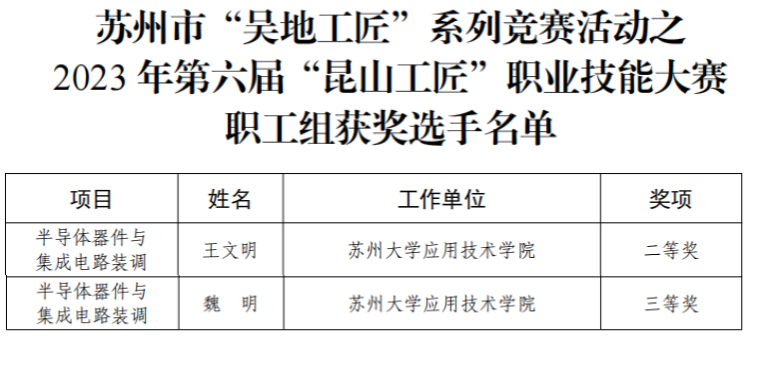 我院教师在2023年第六届“昆山工匠”职业技能大赛中斩获佳绩 2024年01月10日 2023年第六届“昆山工匠”职业技能大赛近日落下帷幕,我院教师王文明、魏明在职工组“半导体器件与集成电路装调”项目中分获二等奖、三等奖。 此次获奖展现了学院教师的专业能力与精湛技巧,积极参加此类竞赛有利于锻炼我院教师的个人专业技能和水平,从而实现教师专业知识、专业技能、专业能力的全方位提升,进一步激发专业创新潜能,更是我院建设高水平“双师型”师资队伍的重要途径。 (人事处) 前一篇 后一篇 【关闭】