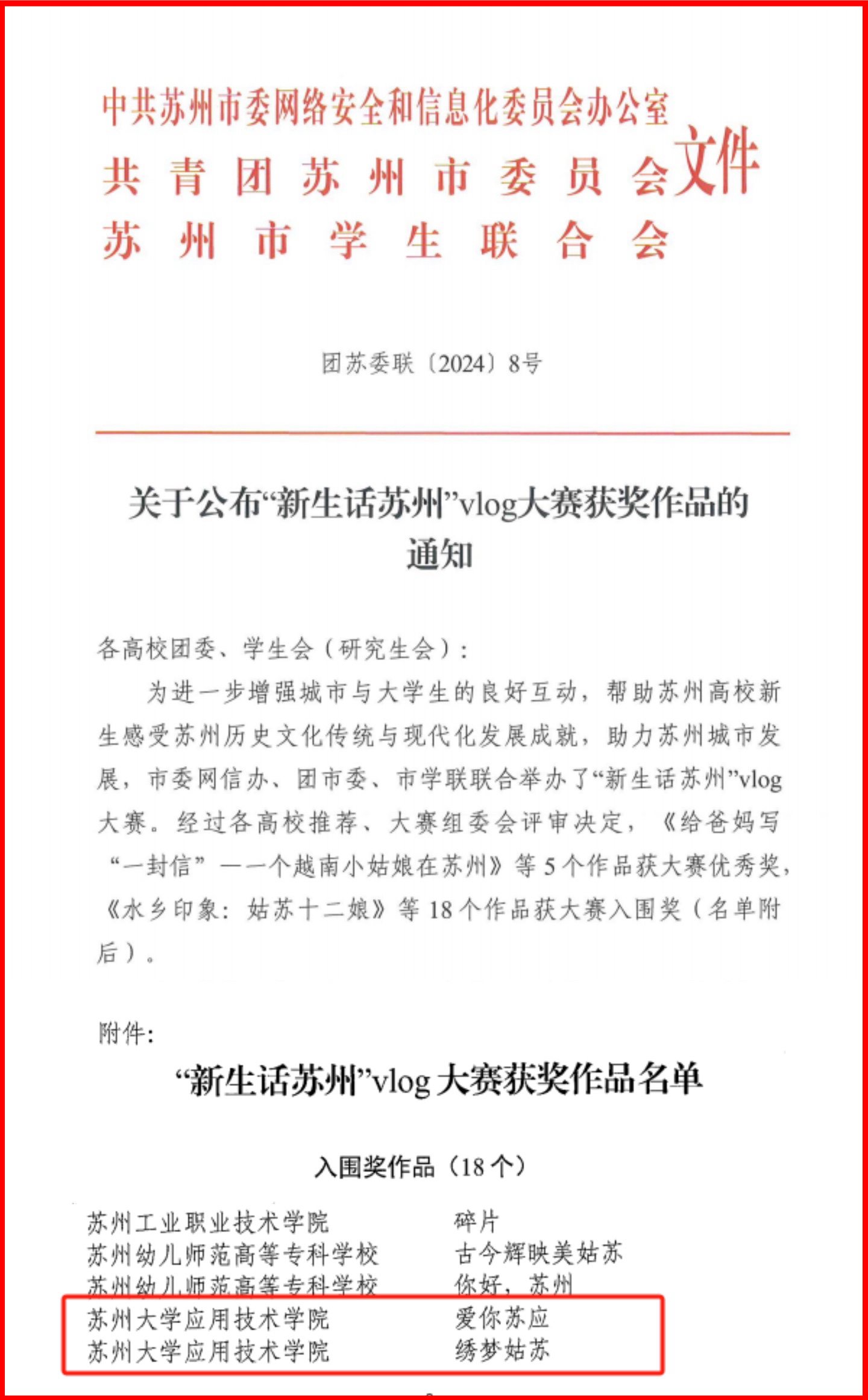 近日,苏州团市委公布了“新生话苏州”vlog大赛获奖作品,经学院团委推荐、组委会评审等环节,我院共有2个作品荣获“新生话苏州”vlog大赛入围奖。本次活动由苏州市委网信办、团市委、市学联联合举办,自活动开展以来收到了同学们的踊跃投稿,经各高校推荐、大赛组委会评审决定,5个作品获大赛优秀奖,18个作品获大赛入围奖。