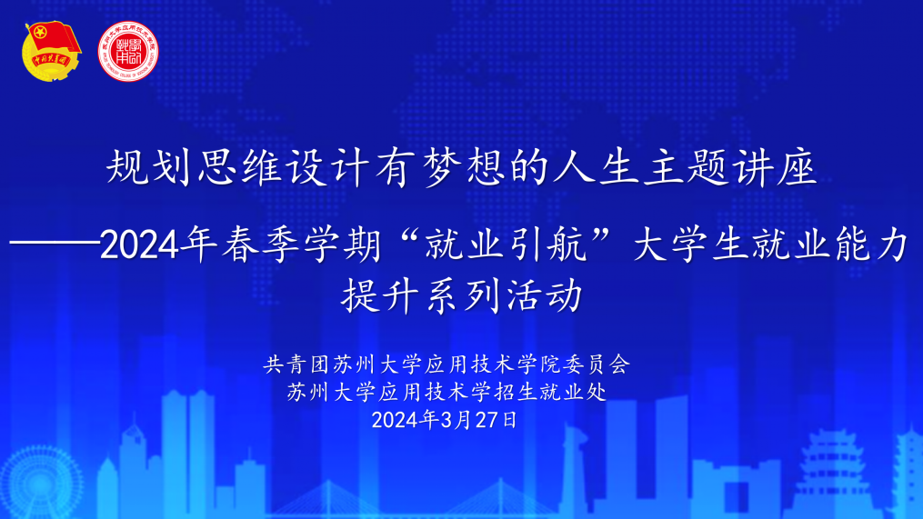 为进一步贯彻落实上级部门相关工作要求,开展好共青团促进大学生就业行动,提升毕业生求职能力和技巧。3月27日下午,我院团委、招生就业处联合昆山市人力资源和社会保障局,在安如楼101举办2024年春季学期“就业引航”大学生就业能力提升系列活动——规划思维设计有梦想的人生讲座。讲座由NCDA国际生涯规划师、国家二级心理咨询师、国家二级人力资源管理师、4D卓越团队领导力认证导师、东尼博赞思维导图认证导师陈文侠主讲。