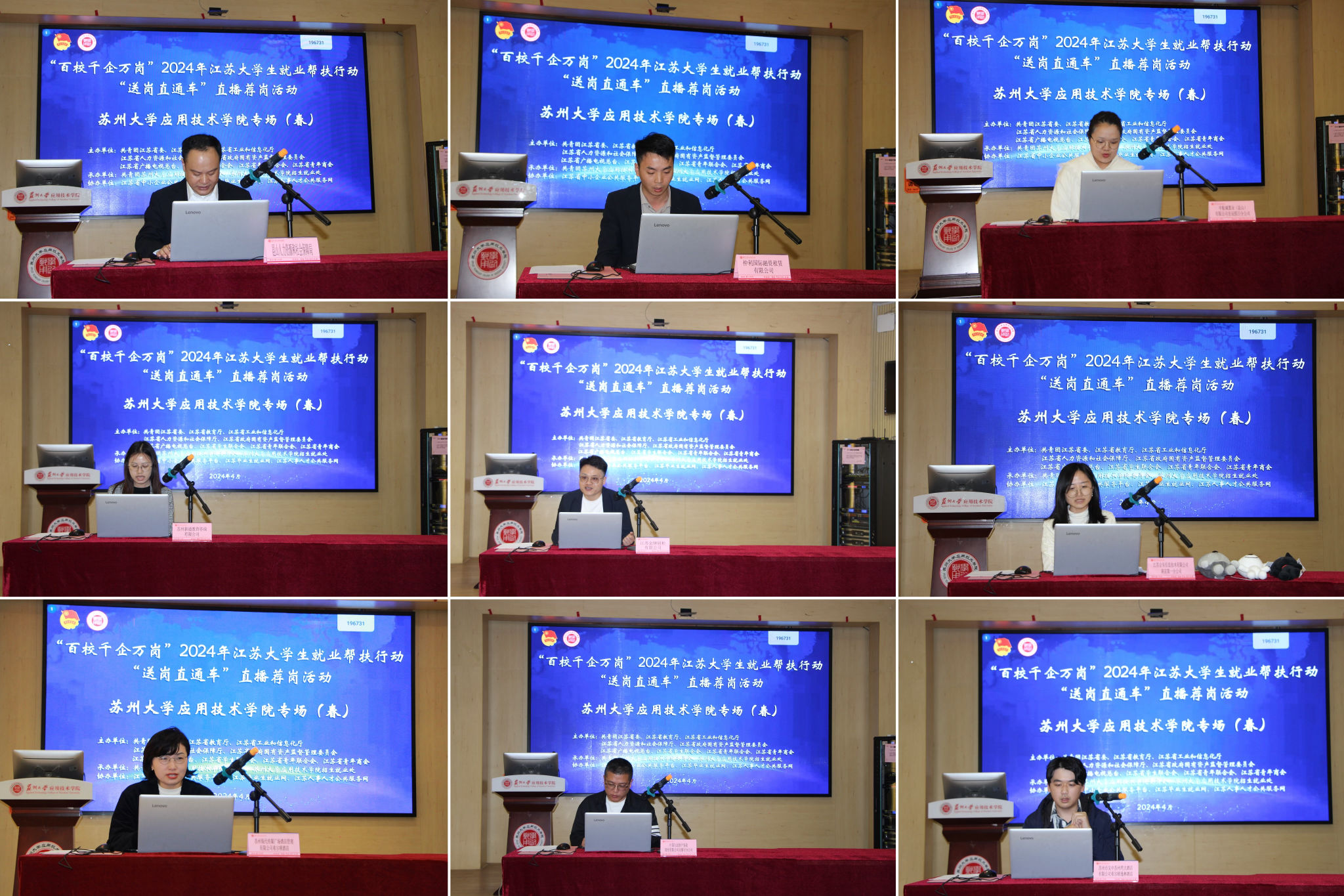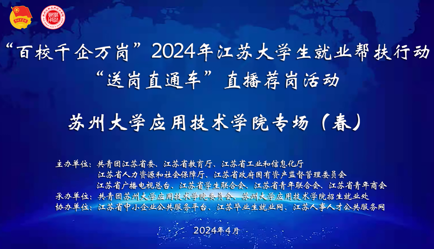 4月13日下午,“百校千企万岗”2024年江苏大学生就业帮扶行动“送岗直通车”直播荐岗活动在我院安如楼101举办。本次活动由共青团江苏省委、江苏省教育厅、江苏省工业和信息化厅、江苏省人力资源和社会保障厅、江苏省政府国有资产监督管理委员会、江苏省广播电视总台、江苏省学生联合会、江苏省青年联合会、江苏省青年商会共同主办,共青团苏州大学应用技术学院委员会、苏州大学应用技术学院招生就业处承办。