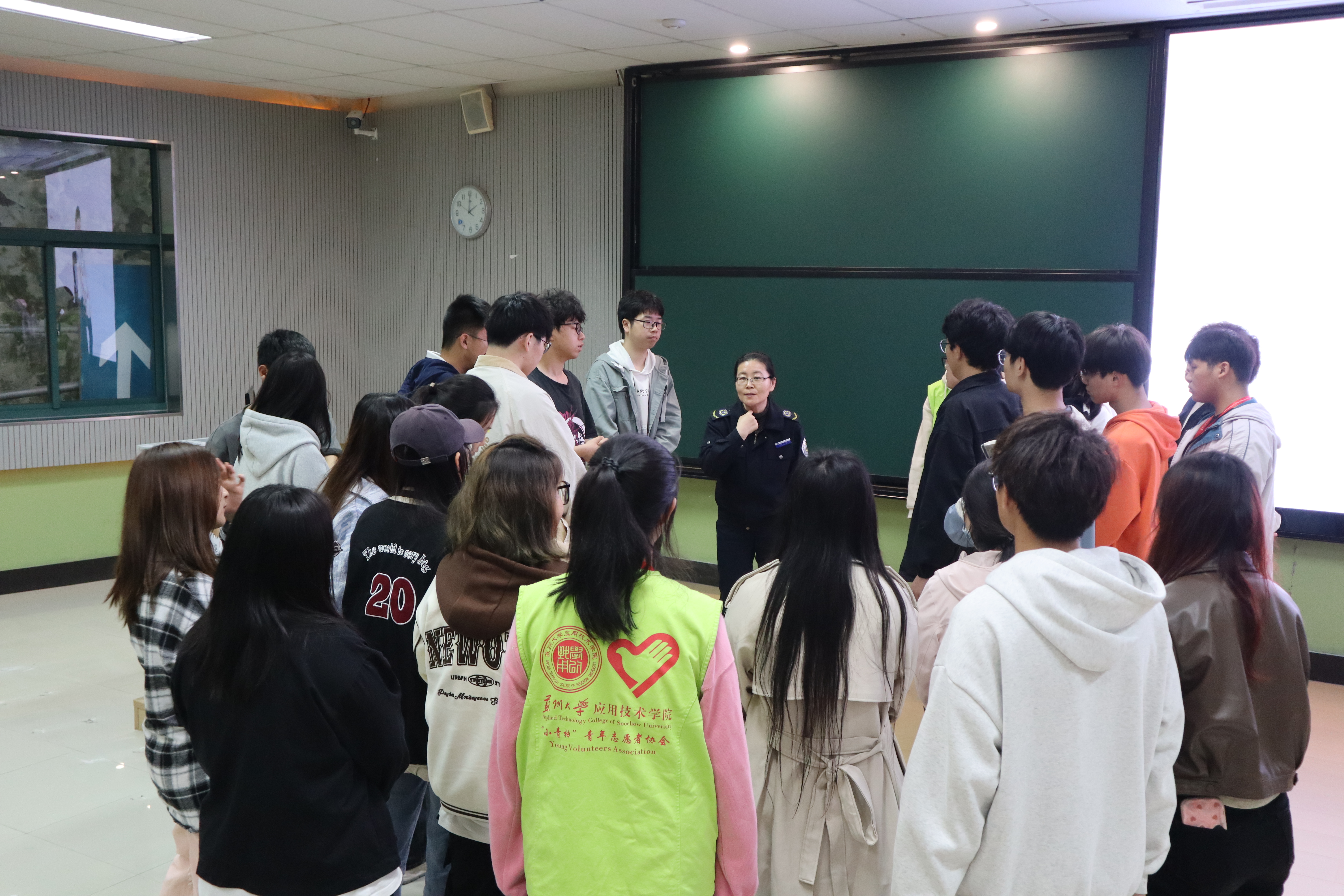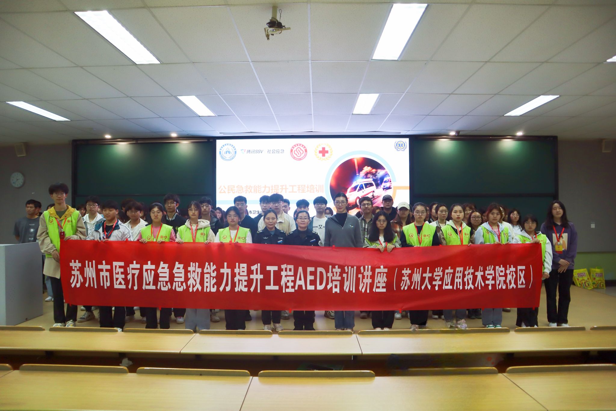 为进一步普及应急救护知识,落实高校学生的安全和培养更多的急救志愿者,提高学生应对突发事件及意外伤害的应急救护和自救互救能力,根据苏州团市委统一部署,4月17日下午,苏州市医疗应急急救能力提升工程AED培训讲座在我院孚新楼101教室举行。昆山急救中心陶秀萍老师作为主讲嘉宾,采用理论讲解与案例视频相结合的方式为同学们传授急救技能。