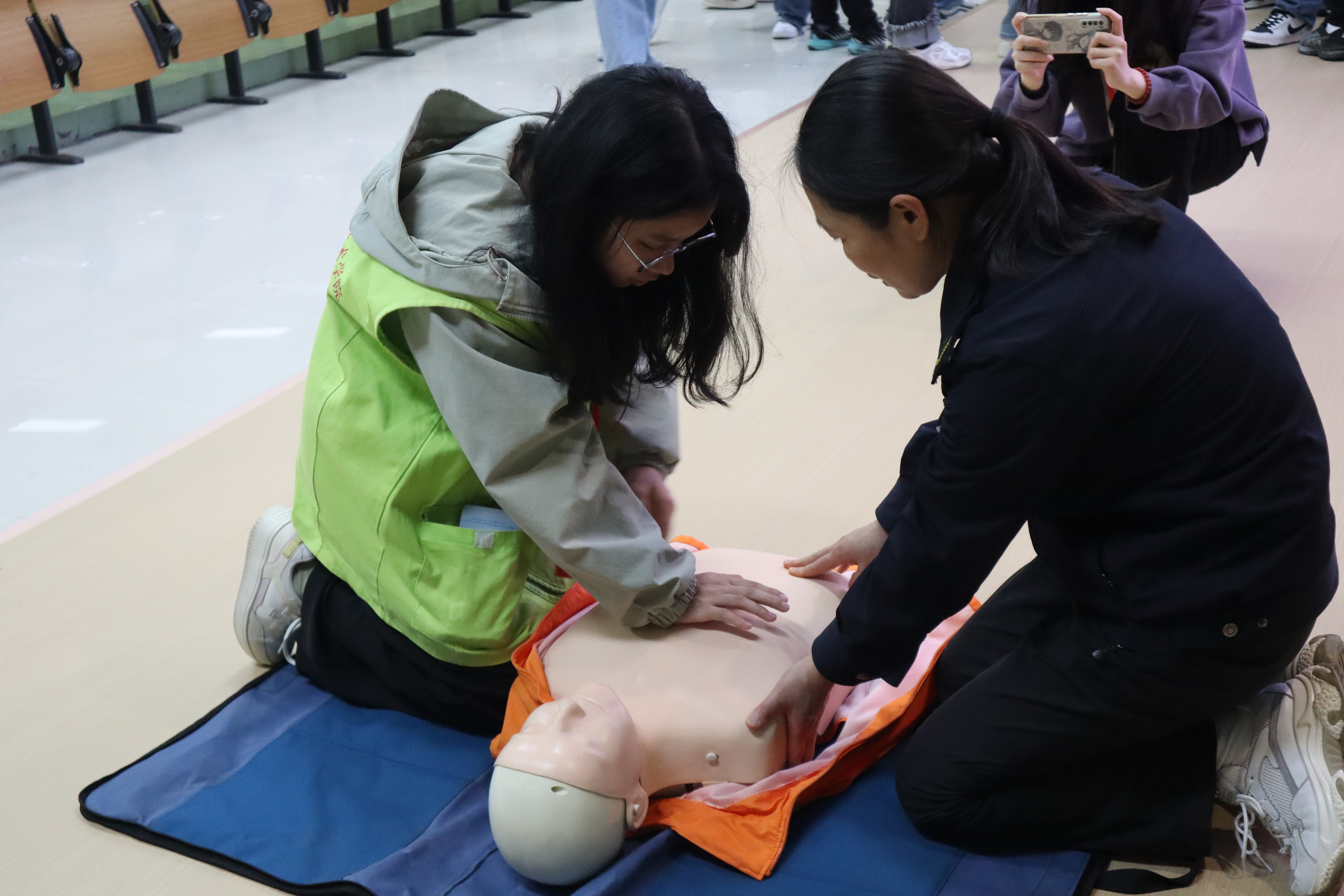 陶秀萍老师现场讲解并演示了正确拨打120急救电话的程序与要点,心肺复苏术(胸外按压)的操作步骤与技术要求,自动体外除颤仪(AED)的使用方法及其重要性,气道异物梗阻的应急处理措施。在理论授课的基础上,重点对“心肺复苏术”和“气道异物梗阻”两个环节的实践操作进行详细讲解和示范。通过一对一、多对一的互动指导,确保每位志愿者都能充分理解和掌握相关技能。