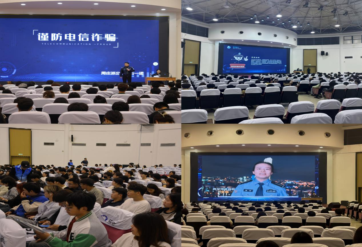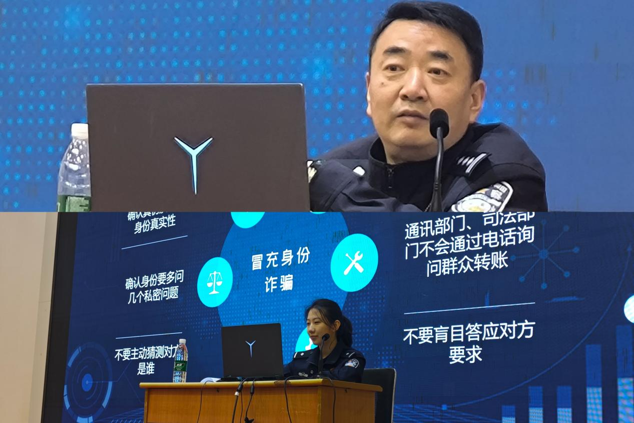 在讲座中,石一诺警官详细介绍了电信网络诈骗的特点,指出其隐蔽性强、手段多样、破案难度大等特征。他详细列举了多种常见的电信网络诈骗类型,如冒充公检法诈骗、网络刷单诈骗、冒充客服诈骗、虚假投资理财诈骗等,提醒学生们在日常生活中要提高安全防范意识,遇骗不惊,不贪小利。此外,钱刚警官深度剖析了当前电信网络诈骗犯罪的严峻形势,向学生们传授了如何识别诈骗信息、保护个人信息、避免上当受骗等实用技巧。同时,为了让大家更直观地感受电信网络诈骗的危害,现场发放了防诈手册、放映了防诈宣传视频,以巩固加深同学们防诈安全意识。