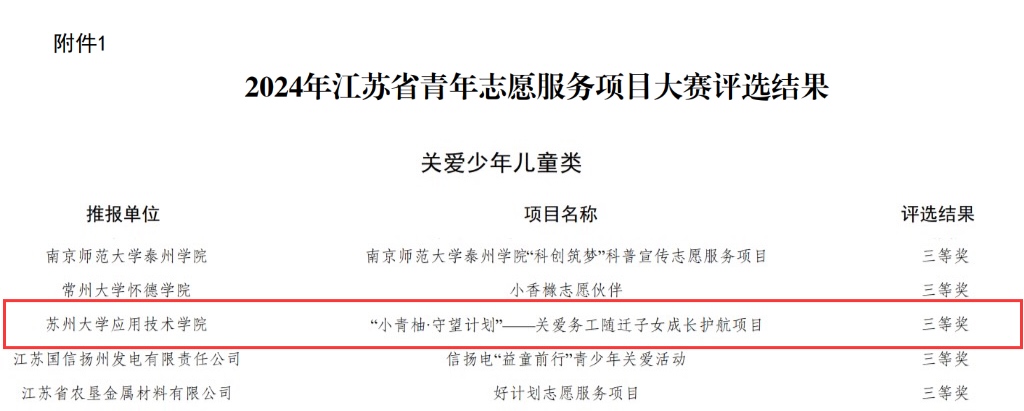 为深入学习贯彻党的二十届三中全会精神,全面贯彻落实习近平总书记关于青年工作的重要思想,弘扬“奉献、友爱、互助、进步”的志愿精神,8月28日,由团江苏省委、江苏省委社会工作部、江苏省青年志愿者协会举办的2024年江苏省青年志愿服务项目大赛圆满结束。我院团委积极响应,动员广大师生精心准备、全力备赛。最终,由我院推报的“‘小青柚·守望计划’——关爱务工随迁子女成长护航项目”志愿服务项目荣获2024年江苏省青年志愿服务项目大赛“关爱少年儿童类”三等奖。
