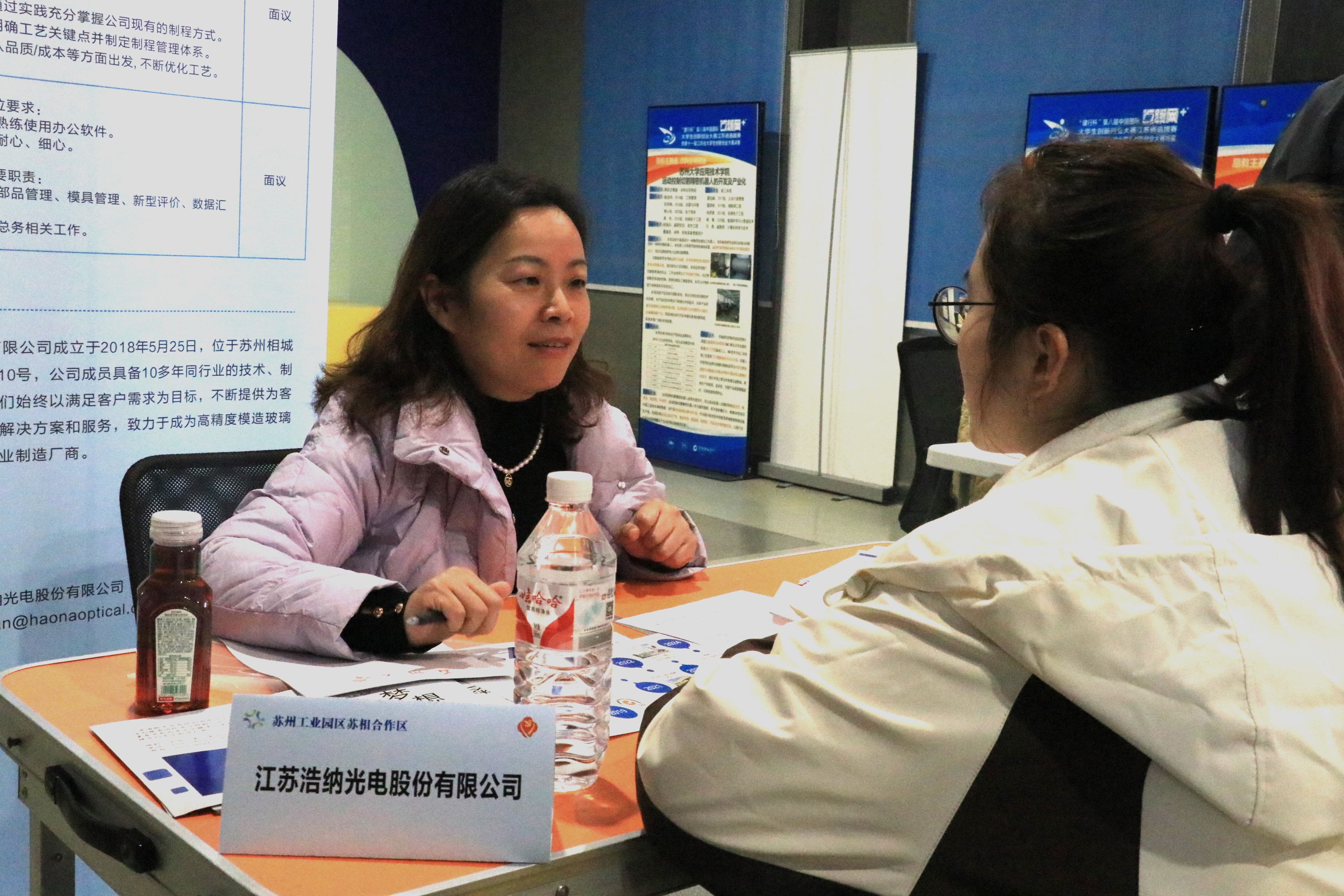 吴通控股集团股份有限公司、苏州利华科技有限公司、江苏浩纳光电股份有限公司等七家苏相合作区知名企业参会,提供了涵盖工程师、生产技术员、储备干部、管培生、技术员等多个领域的百余个岗位,为工学院学子提供了丰富的职业选择。招聘会现场,人头攒动,气氛热烈而有序。每家企业的展台前都摆放着企业宣传册和岗位信息,吸引着大批毕业生驻足咨询。企业代表们热情地解答着学生们关于岗位职责、发展前景、薪资待遇等方面的问题,不时地与学生交换联系方式,以便后续深入交流。