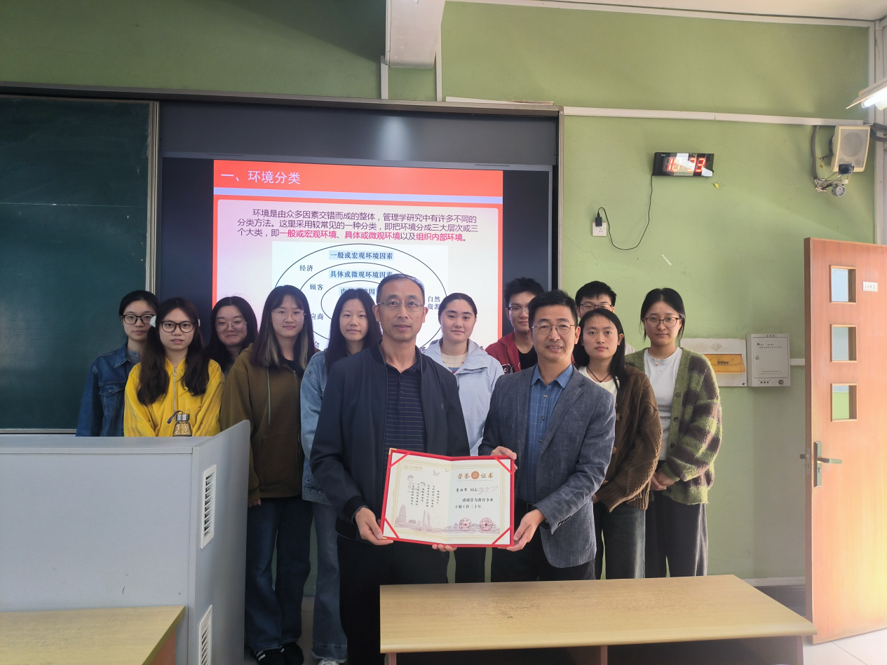11月5日,博习楼108的教室里洋溢着庄重而温馨的氛围,一场别开生面的“从事教育教学工作三十年荣誉证书”颁发仪式在这里温馨举行。全班师生齐聚一堂,共同见证这一荣耀时刻。费湘军老师手捧荣誉证书,表达了自己对学院、学生的感激之情。