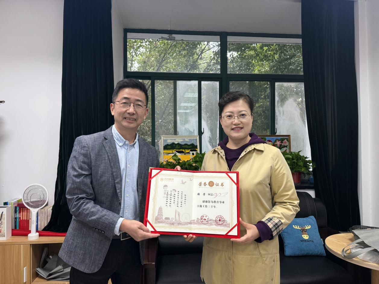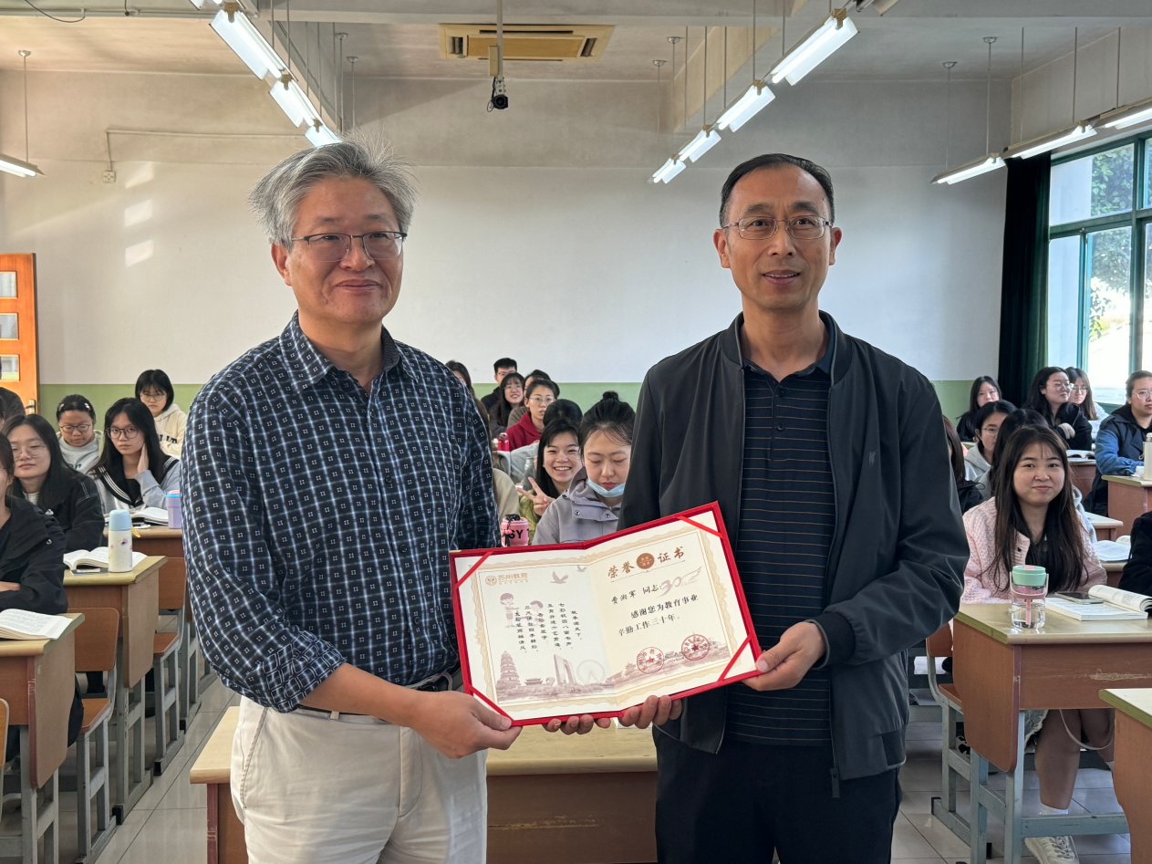 近日,在金秋送爽、硕果累累的季节里,我院工会为在教育战线默默奉献了三十年的优秀教师们分别颁发了“从事教育教学工作三十年”荣誉证书。获得从事教育教学工作三十年荣誉的是工学院吴一帆老师、商学院费湘军老师、周庄文旅学院张芳老师,工会主席何为一一来到了老师们课堂利用课间时间为他们颁发荣誉证书,在场苏应学生、工会委员、工会小组长们也在现场共同见证了这一特殊的时刻。