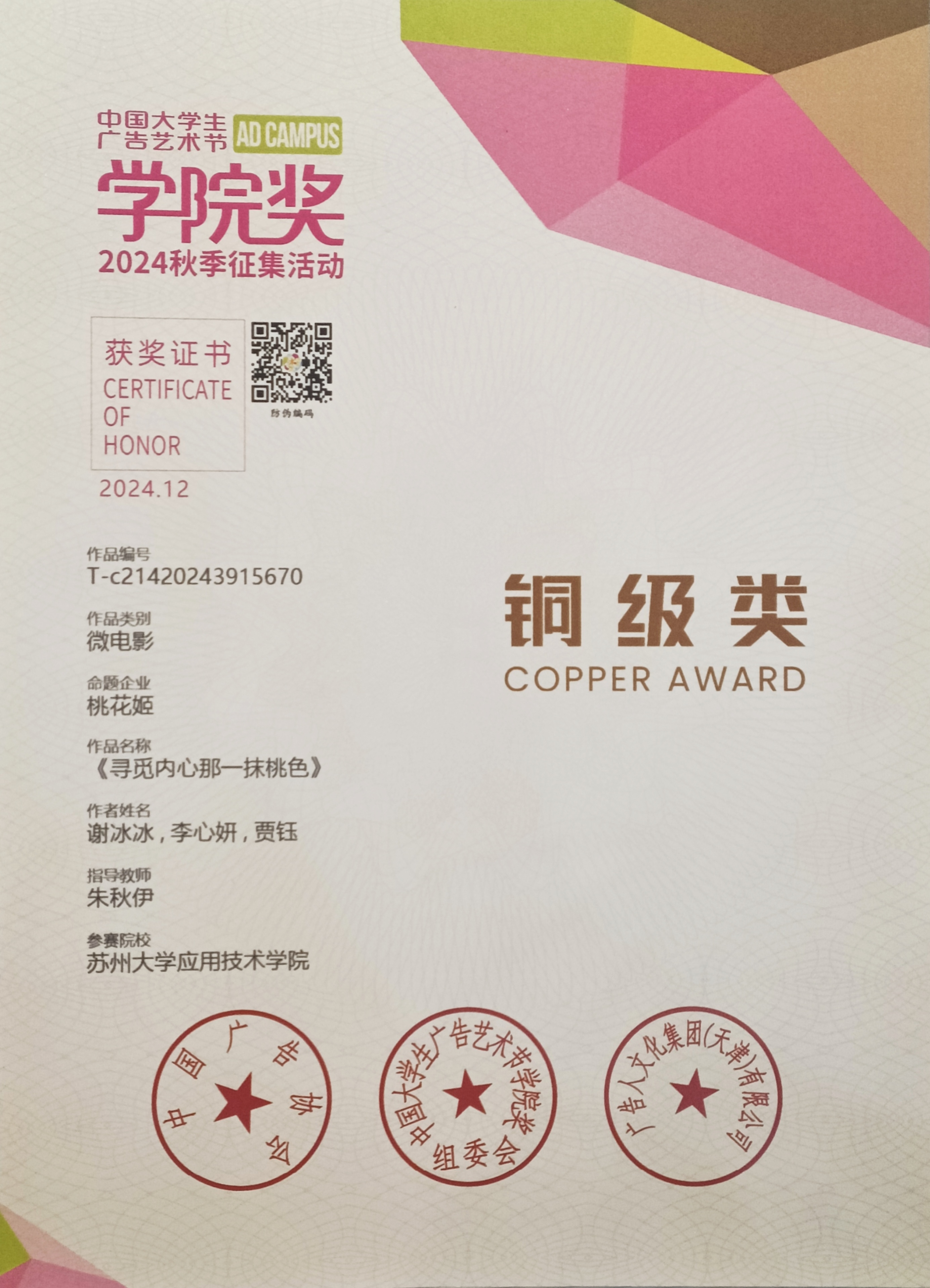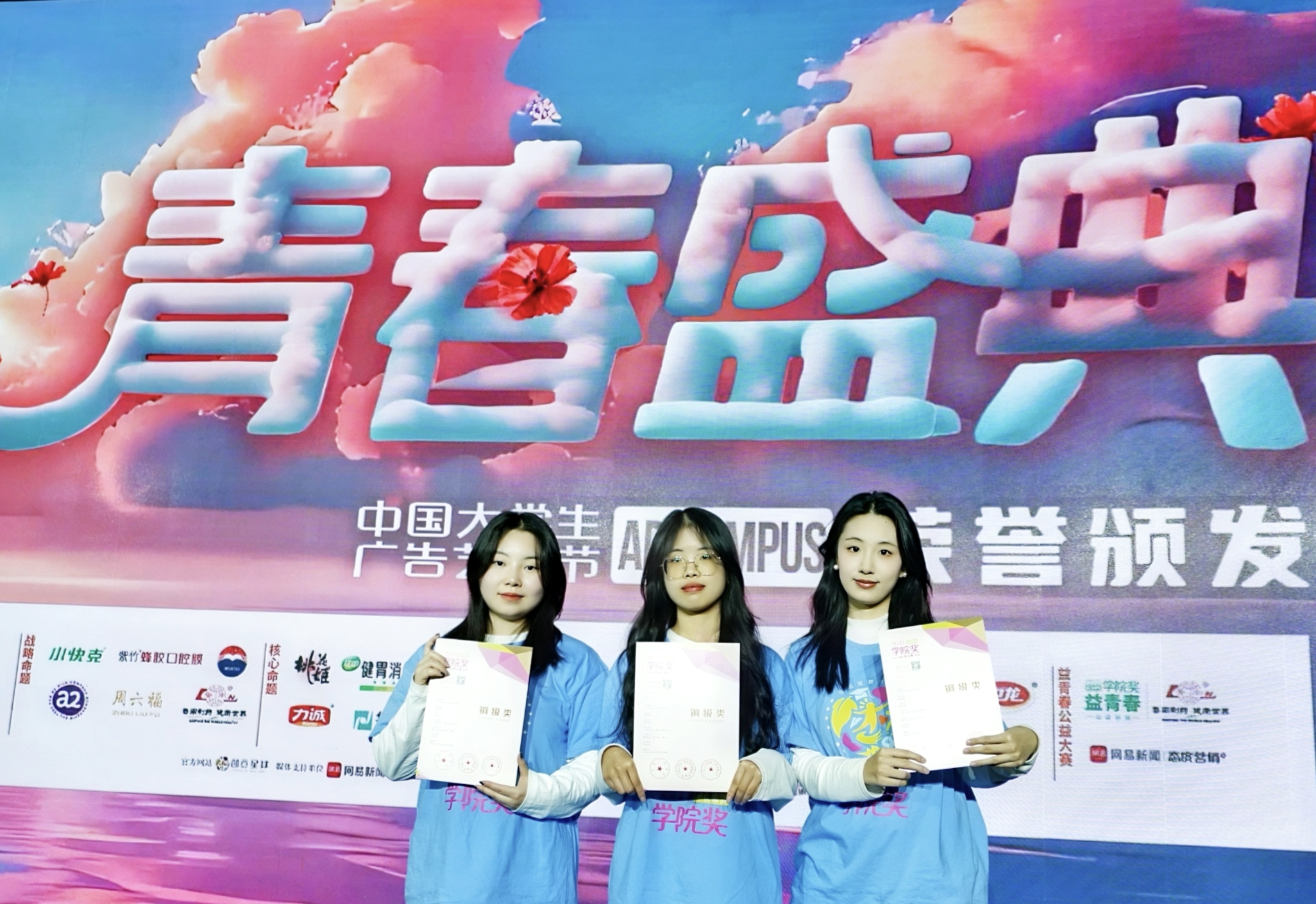 12月26日,中国大学生广告艺术节学院奖2024秋季“青春盛典”颁奖典礼在北京广播大厦举行。我院艺术系广告学专业学生谢冰冰、李心妍、贾钰组成的团队在全国上万支参赛队伍中脱颖而出,最终获微电影类国家级铜奖、指导教师朱秋伊荣获优秀指导教师。