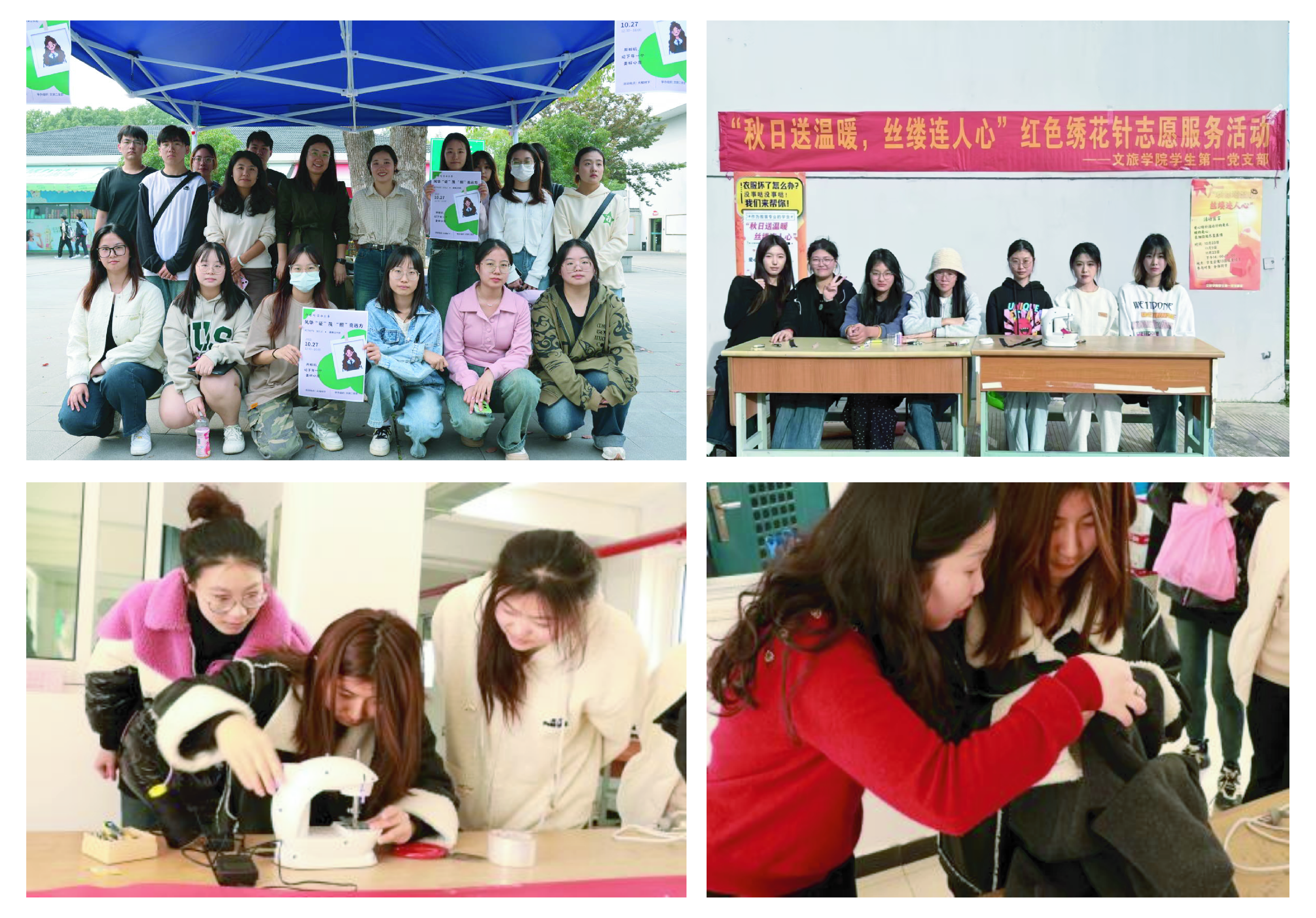聚焦“小切口”,汇聚“大能量”。文旅学院开展了“秋日送温暖,丝缕连人心”红色绣花针志愿服务活动、“小小医药箱,健康伴同行”医药箱安置活动、“一针一线总关情,细心缝补暖人心”志愿服务活动、“风华‘证’茂,‘照’亮远方”最美证件照拍摄活动。一件件用爱修缮的衣物、一张张精美的证件照片、一个个小小救护物品,党员志愿者发挥专业特长,切实从同学需求出发,解同学燃眉之急,做同学需求之事,将温暖和爱心传递到社区的每一个角落。