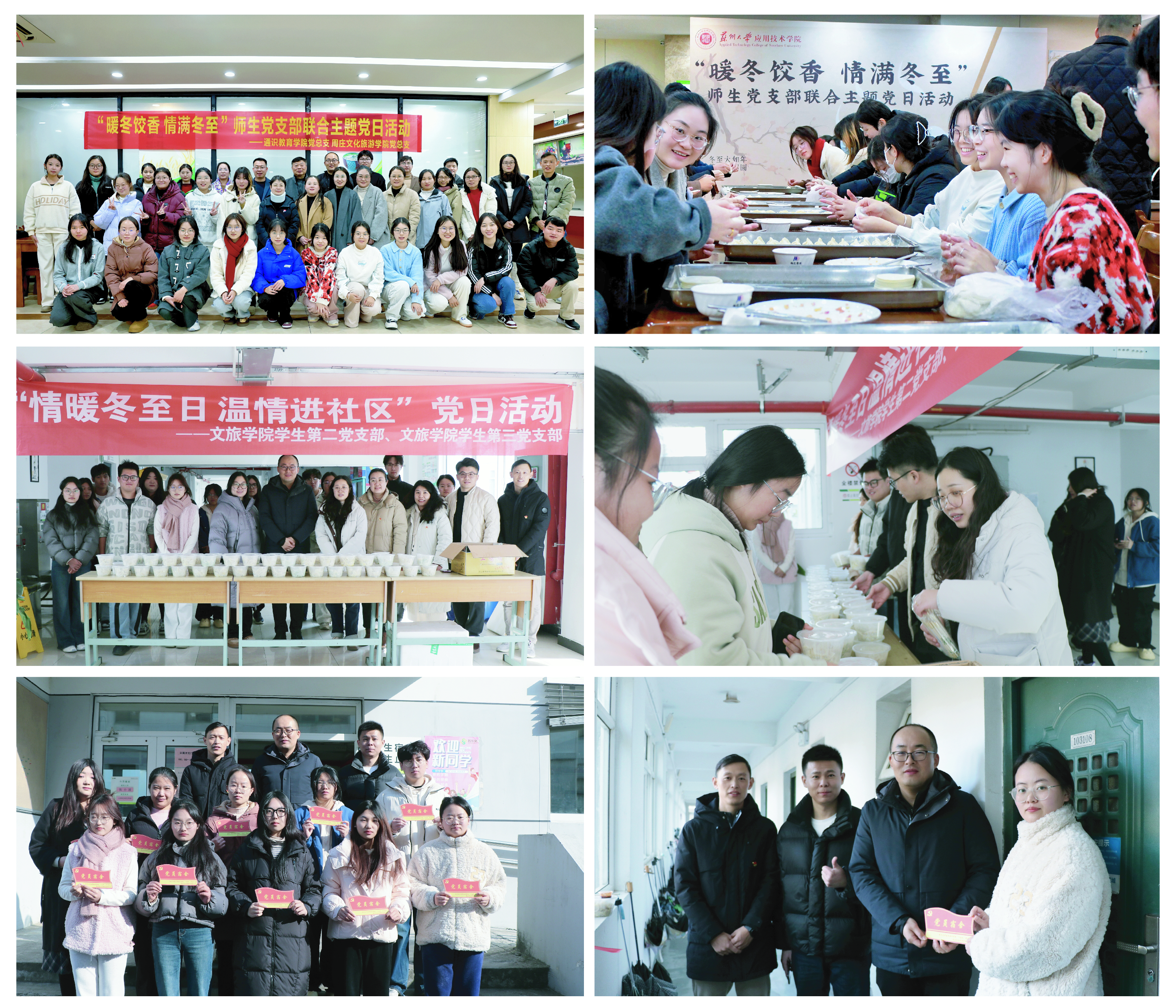 冬至寒意浓,相伴暖人心。冬至来临之际,文旅学院开展了“暖冬饺情,情满冬至”“情暖冬至日,温情进社区”“情满冬日,爱满校园”冬日送温暖物资发放等主题党日活动,师生齐聚一堂,一边包饺子,一边畅谈冬至的传统习俗,在寒冷的冬日为学生送上“温暖”,让师生情在热腾腾的饺子中不断传递、不断升温。同时党总支以冬至送温暖为契机,深入学生宿舍发放“党员宿舍”标识牌,期望每位党员都能够在学习、生活等方面做表率,以实际行动展现党员风采,充分发挥“一名党员就是一面旗帜”的示范带动效应。