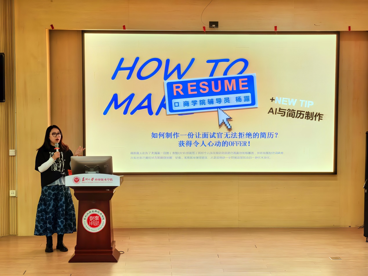 3月27日,商学院第六届“职涯嘉年华”生涯规划大赛系列活动之“AI赋能简历优化”主题讲座在安如楼101成功举办。活动聚焦数字化时代求职新趋势,由商学院辅导员杨露主讲,通过“理论+工具+案例”三维赋能,助力学生掌握智能化简历撰写技巧,吸引了百余名学生参与。