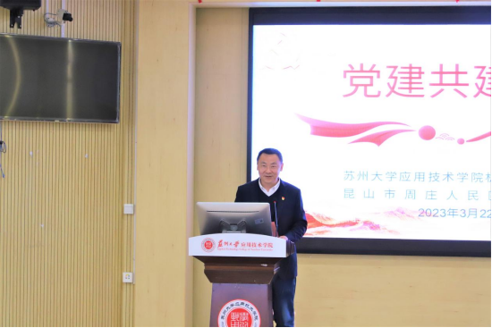 3月22日上午,苏州大学应用技术学院机关第四党支部与昆山市周庄人民医院党支部在学院A楼101报告厅签署《“服务师生践初心、校医联动健康行”党建共建活动协议书》。昆山市周庄人民医院院长、党支部书记李运峰,副院长吕冠明,苏州大学应用技术学院党委委员、副院长席拥军及后勤与资产处处长周柏海、机关党总支书记姜帅、机关第四党支部书记徐卫斌,双方支部党员参加了本次活动。