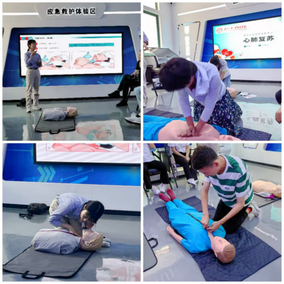 在应急救护体验区,学员们学习了AED除颤仪、心肺复苏、海姆立克法急救法的相关知识,苏州大学苏州医学院张青老师讲解并现场演示了心肺复苏的具体步骤。在老师示范以后,安全员纷纷上台演练,进行实践操作。
