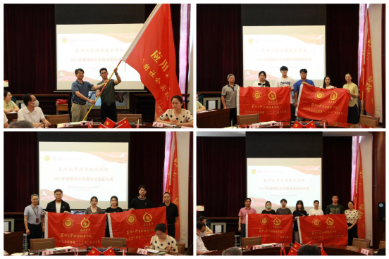 会上,王卫东宣读了2023年暑期社会实践立项资助团队名单。钮秀山为苏州大学应用技术学院社会实践总队授旗,职能部门领导为实践小分队授旗。
