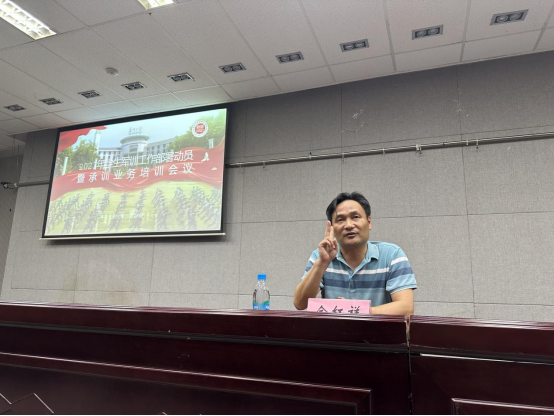 金红祥作学生军训教官动员讲话。他介绍了今年学生军训工作的整体情况,对积极参与承训工作的教官表示感谢。他说,今年军训学生人数比去年有所增加,责任重任务重,一定要落实好安全第一的带训原则,在安全保障的基础上,扎实开展好今年的军训工作。同时,他要求全体教官要遵守纪律,服从团队统一管理,严格恪守军训工作条令,保障军训工作平安、顺利的完成。