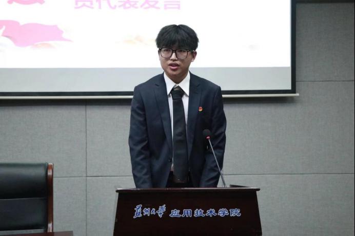 苏州大学2023年第二期发展对象培训班学员代表,文旅学院学生第三党支部周俊勇同学进行发言。他号召全体学员做到以下三点:第一,青春向党,坚定信仰;第二,行学不辍,知行合一;第三,磨练党性,提升修养。